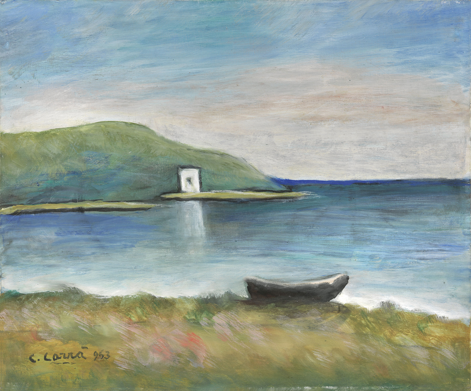 Carlo Carrà Quargnento (Al) 1881 - Milano 1966 Casa solitaria, 1963 Olio su tela, cm. 50,5x60 Firma e data in basso a sinistra: C. Carrà 963. Storia Collezione privata, Torino; Collezione privata Foto autenticata dall'artista in data 4/12/63. Bibliografia Massimo Carrà, Carrà, tutta l'opera pittorica volume III, 1951-1966, L'Annunciata / La Conchiglia, Milano, 1968, p. 521, 586, n. 4/63 (con misure cm. 40x50).