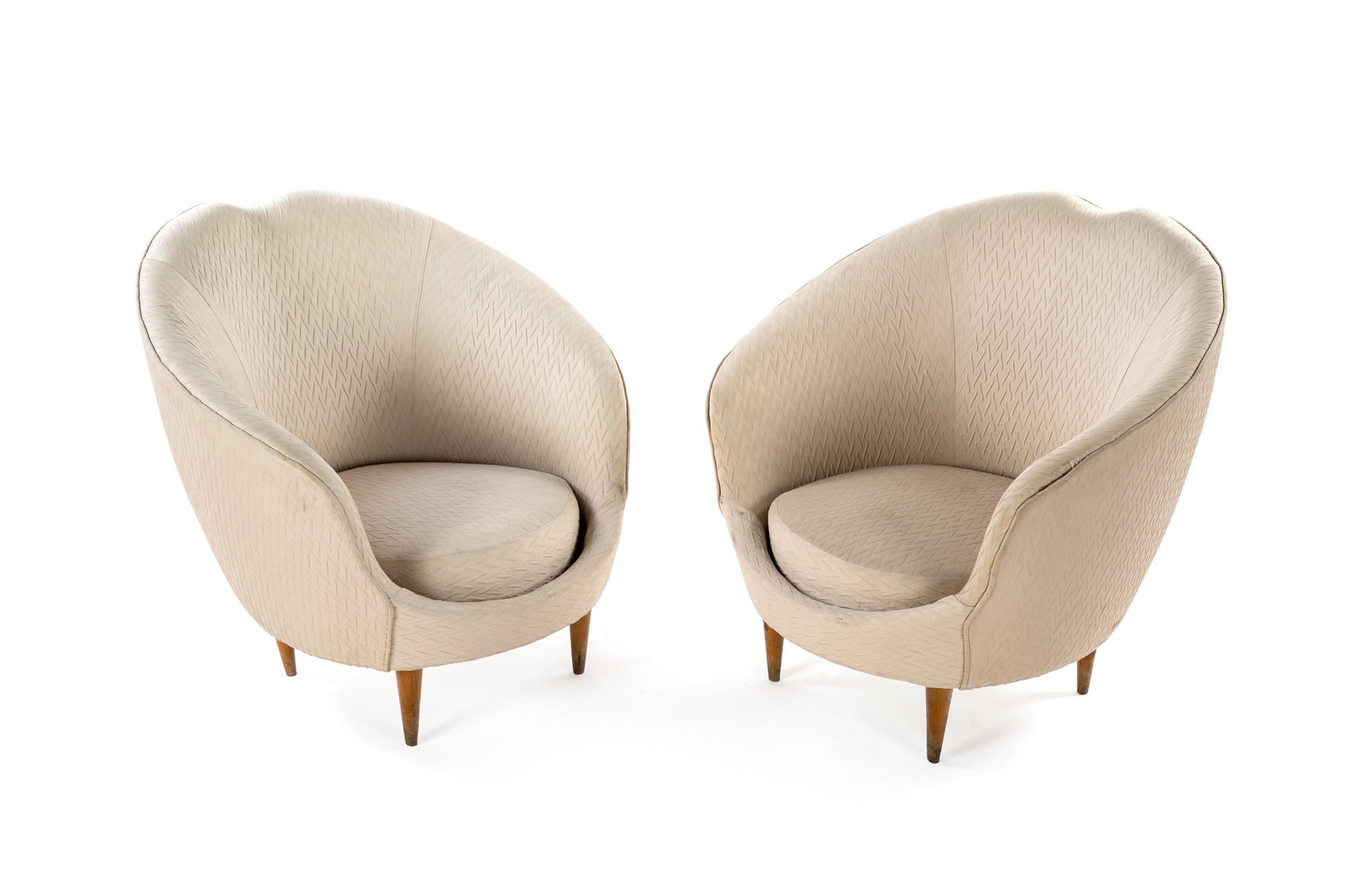 ICO PARISI Attr. Coppia di poltrone - a forma di uovo struttura in legno rivestimento in tessuto da rivedere piedini conici Prod. Italiana - cm 75x78x76 - 1950