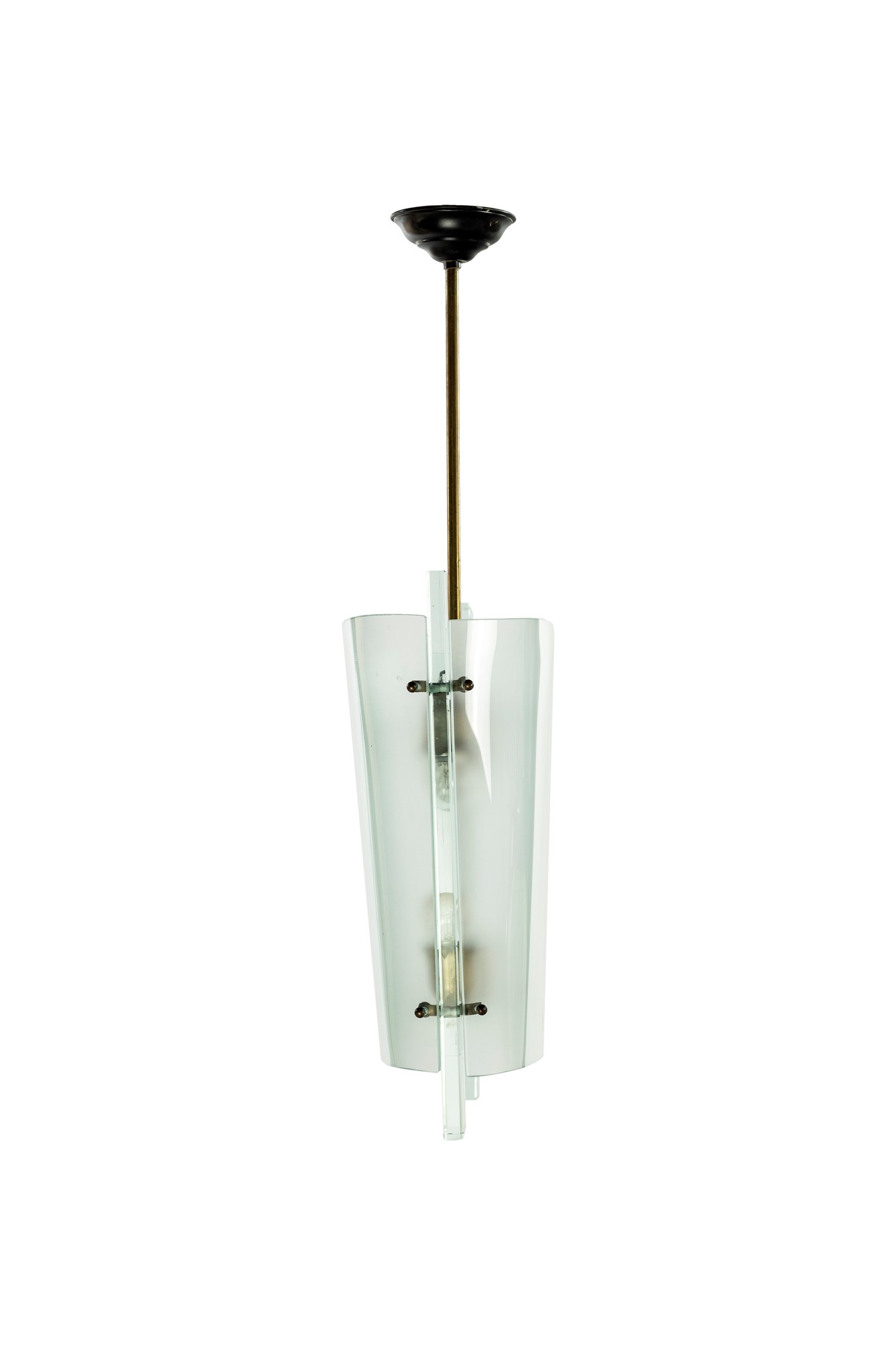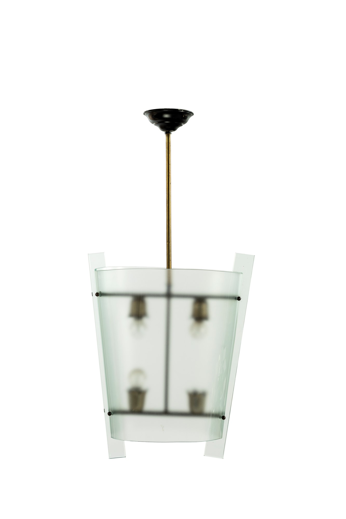 FONTANA ARTE Lampadario - due cristalli curvati e satinati quattro luci dettagli in ottone - cm 48x40x20 - 1940ca