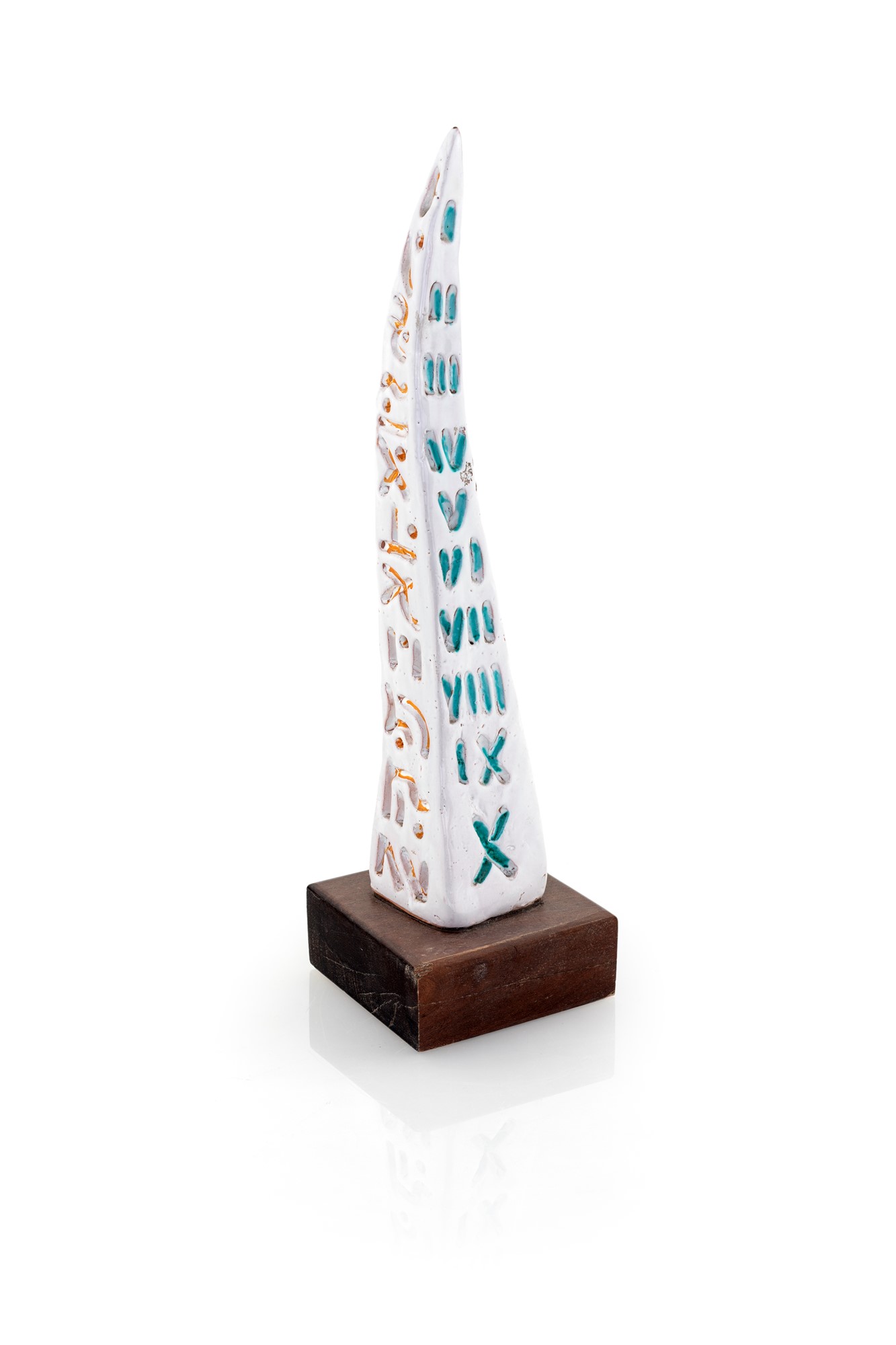 PRODUZIONE ITALIANA Obelisco - scultura in terracotta smaltata con incisi simboli egizi e numeri - cm 14 - 1950
