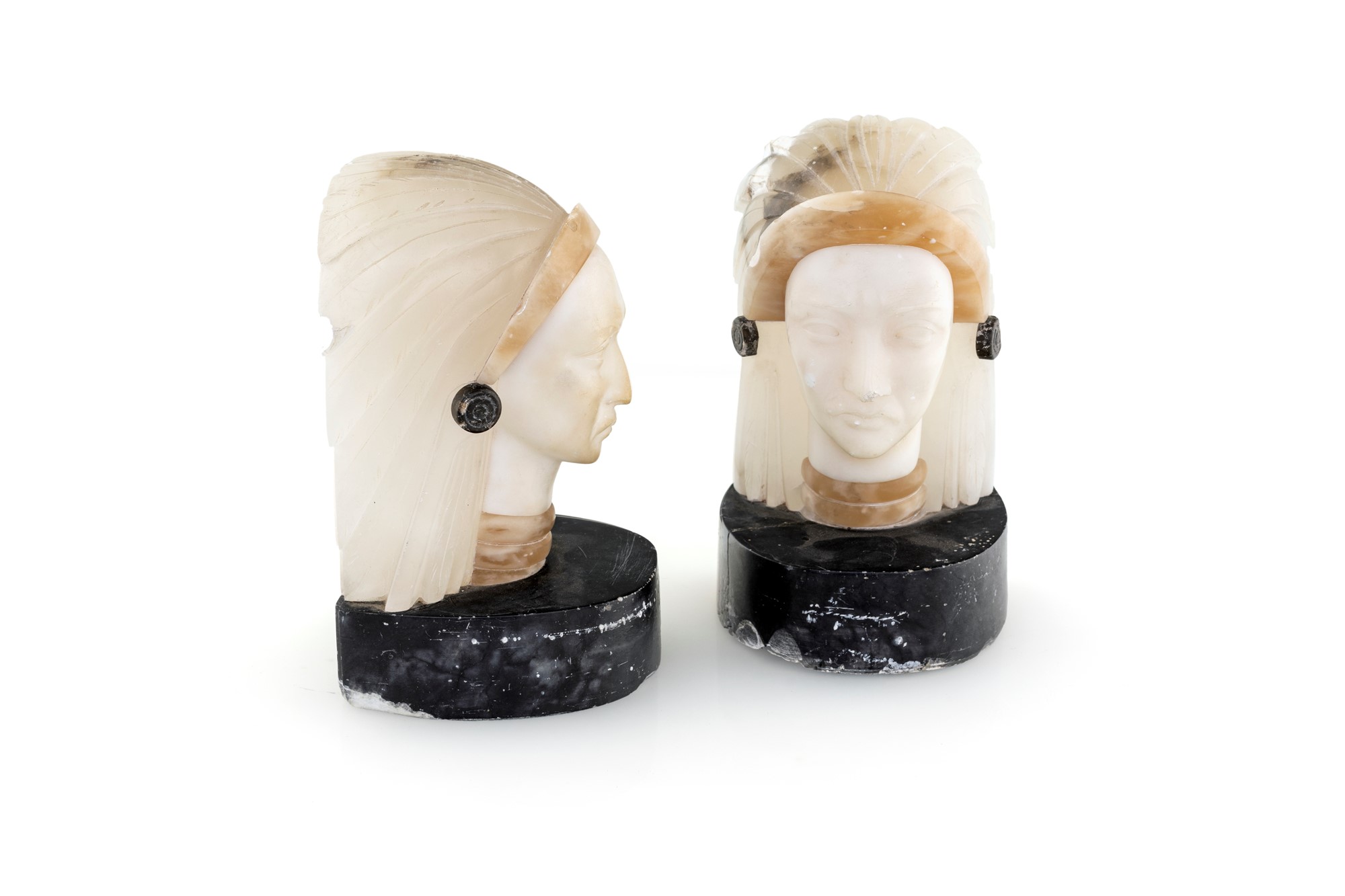 PRODUZIONE ITALIANA Fermalibri - figure di testa di indiani d'america in alabastro di Volterra (piccoli difetti) - cm 20x20x10 - 1940