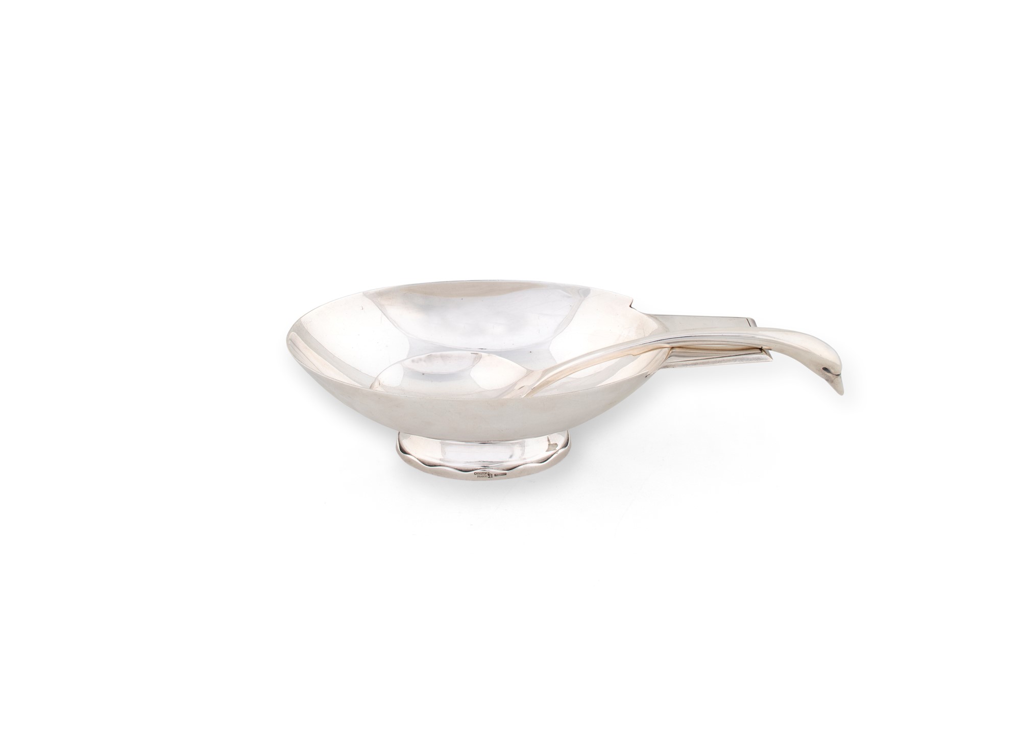 CHRISTIAN FJERDINGSTAD Salsiera - con cucchiaio a forma di cigno in metallo argentato Firma incisa per Christofle Gallia - cm 6x20x10 - 1930