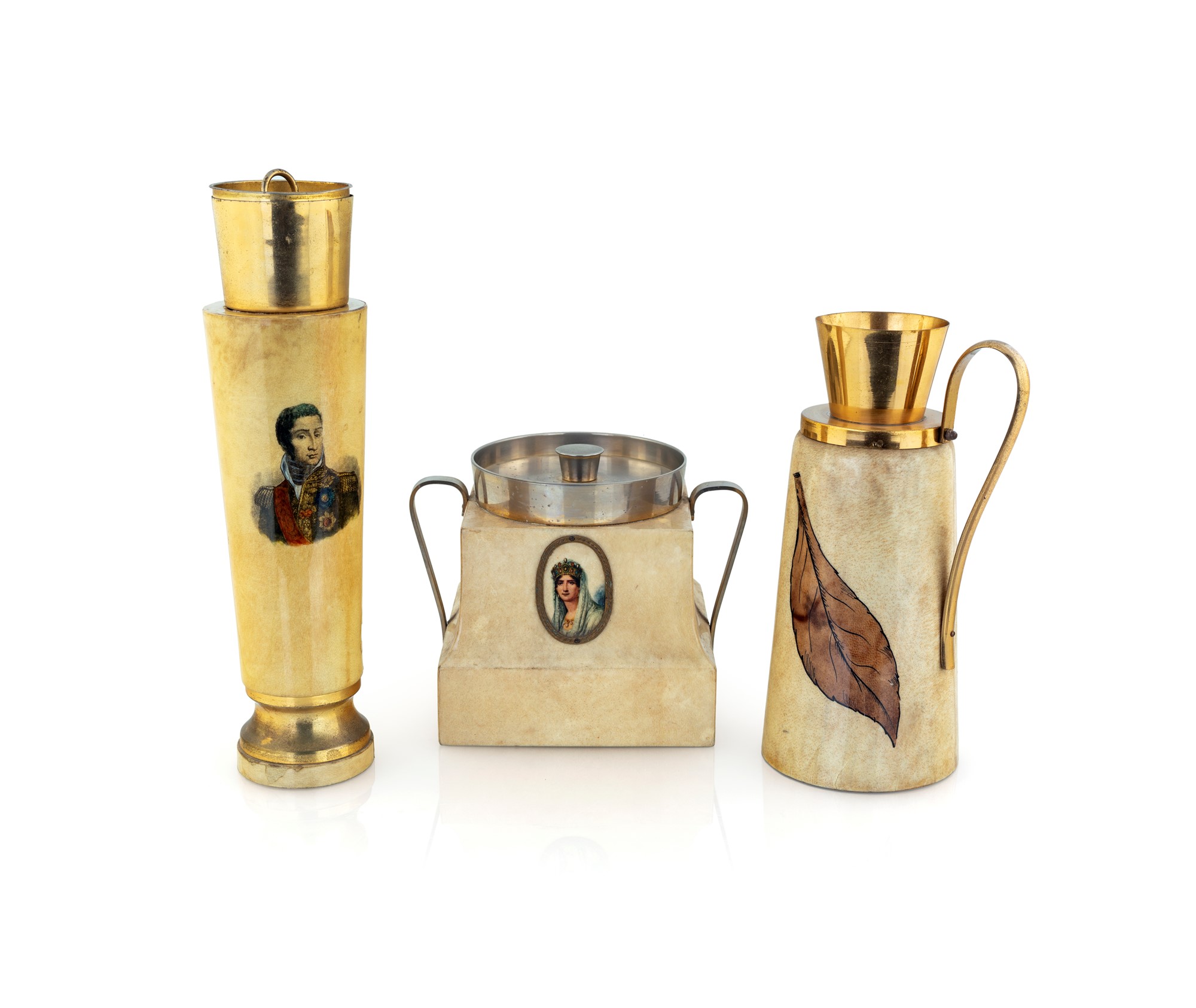 ALDO TURA Set da bar - in pergamena con figure Napoleoniche dettagli in ottone Prod Italia. - Shaker cm 34, Brocca cm 27 Portaghiaccio cm 16x17x17 - 1950