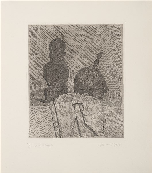Giorgio Morandi "Natura morta con due oggetti e un drappo su un tavolo" 1929 acq