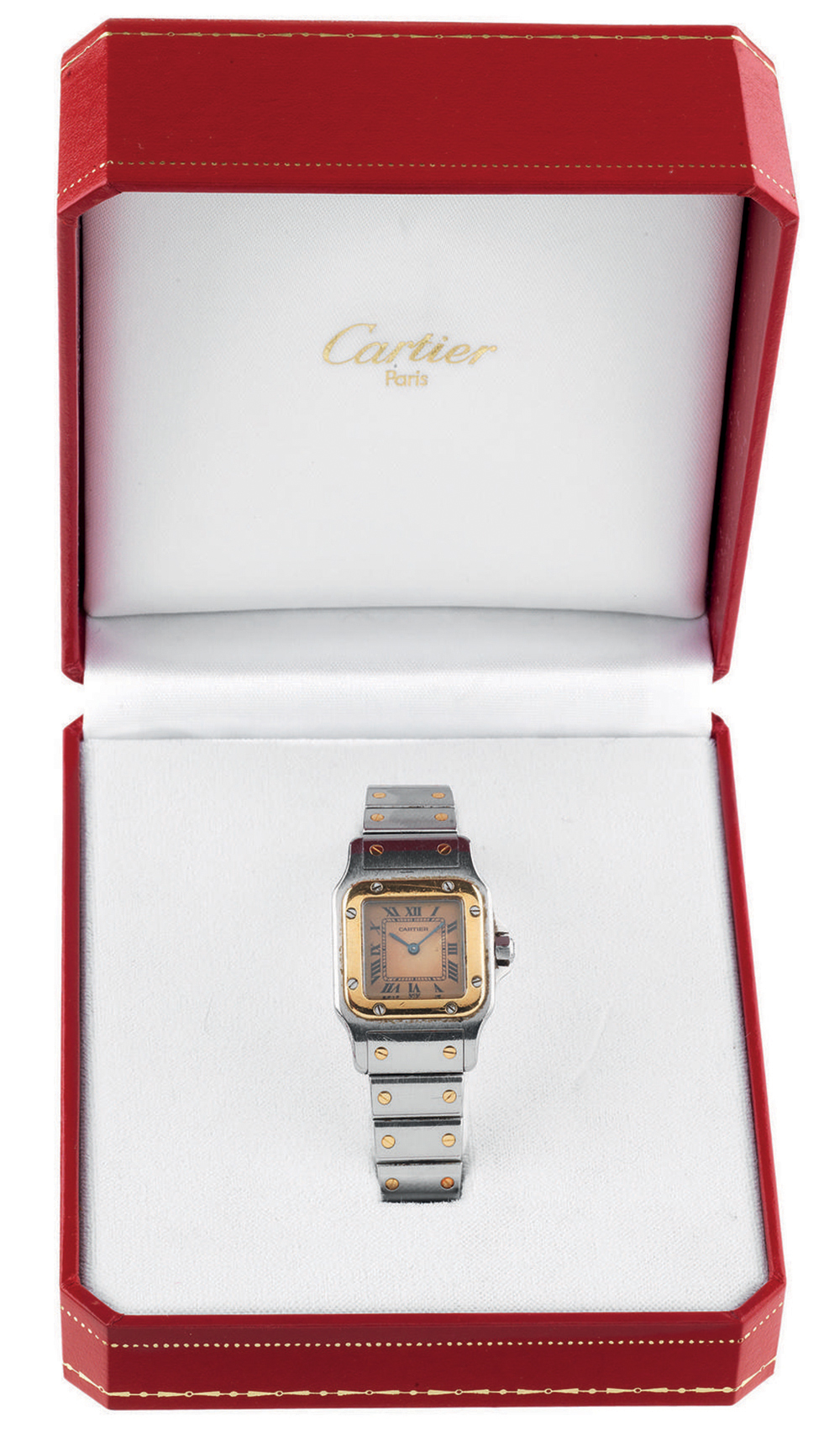 orologio da polso per signora in acciaio e oro, con bracciale Cartier e chiusura deployante