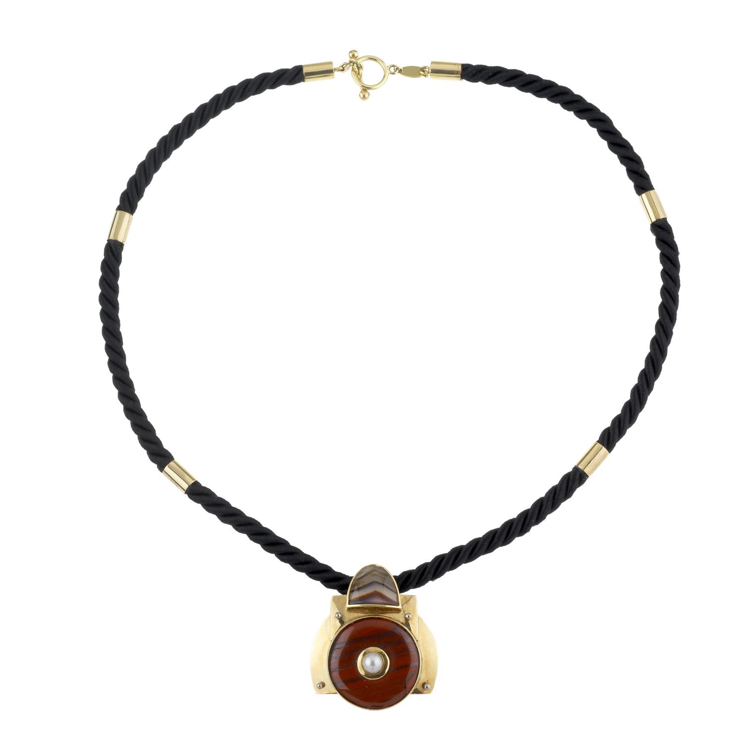 AGATE, PEARL AND YELLOW GOLD PENDANT WITH A SILK CORD AND YELLOW GOLD NECKLACE, CIRCA 1990