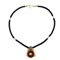 il pendente di forma sagomata decorato da inserti geometrici in agata striata e da una perla coltivata è sospeso ad una collana realizzata in cordonetto torchon di seta nera su cui sono montati elementi cilindrici in oro, fermatura in oro giallo firmata Rita Gallé, lung collana cm 50, dimensioni pendente cm 4x3,5, peso complessivo g 34