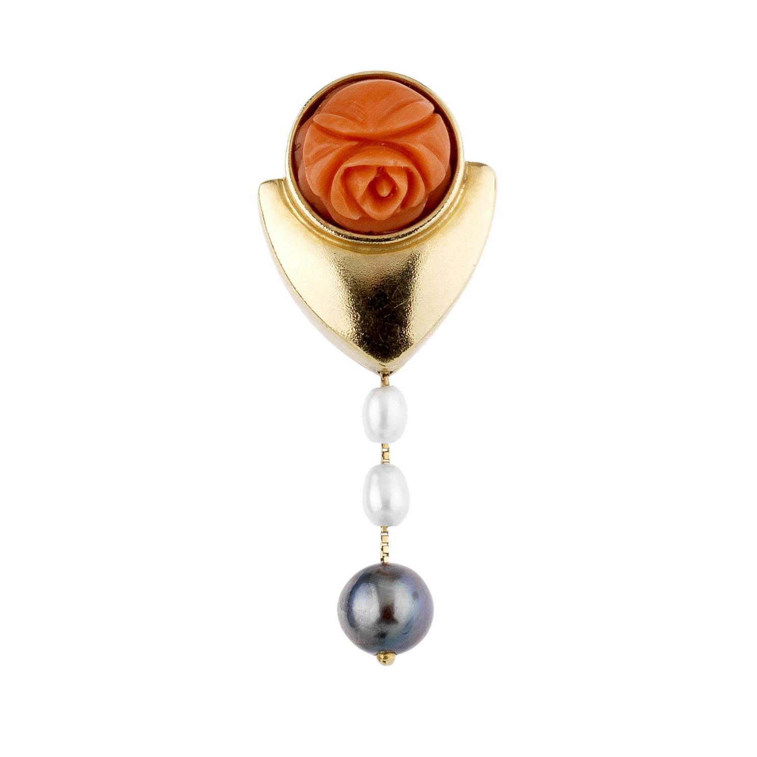 di forma geometrica, impreziosito da un corallo intagliato a rosa e da una linea di piccole perle bianche e grigia, punzone Rita Gallé, lung cm 3,5, g 7 circa