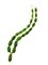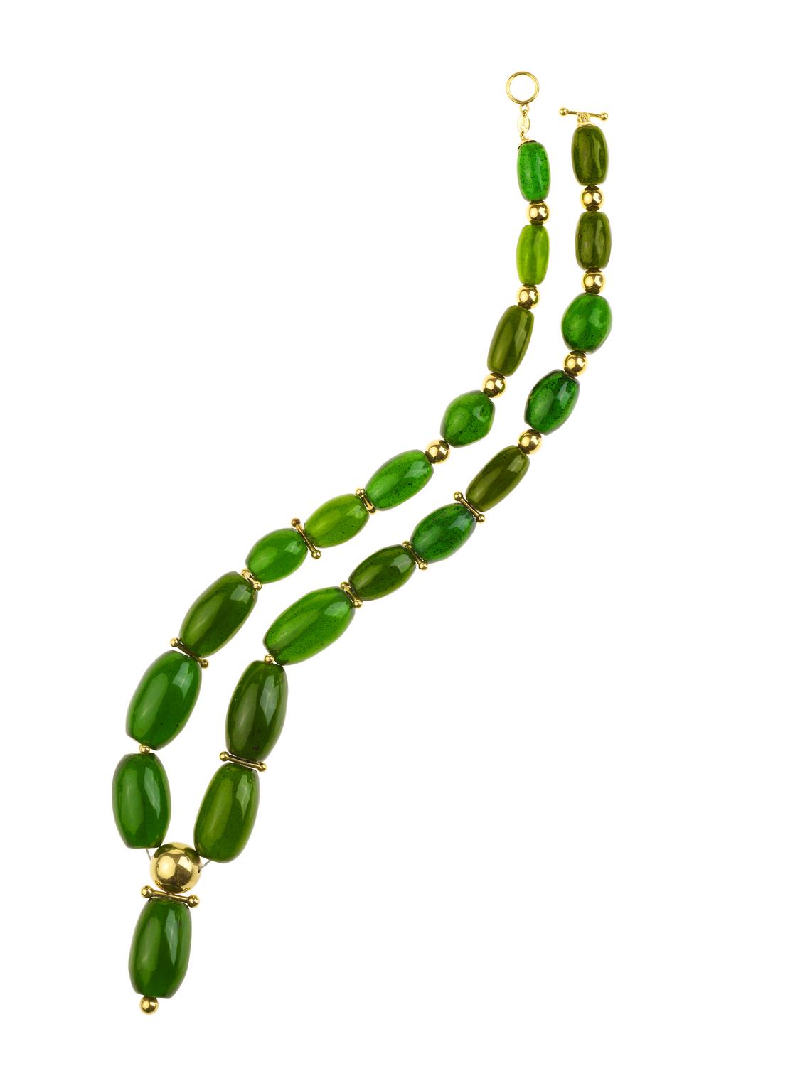 realizzata ad una fila di elementi a spoletta in resina artificiale di colore verde, intercalati da sfere e distanziatori in oro giallo 18kt, firma incisa Rita Gallé, lung collana cm 68, g 141 circa