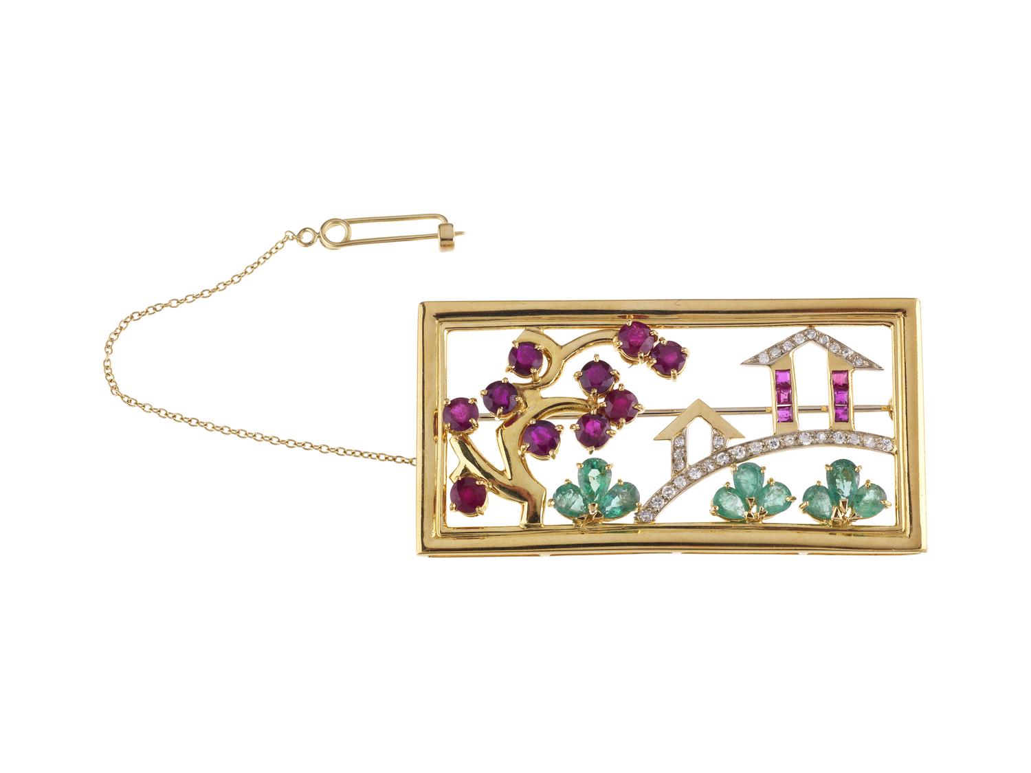 di forma rettangolare, raffigurante un paesaggio orientale realizzato in oro traforato e decorato in diamanti taglio huit huit per ct 0.25 circa, smeraldi taglio a goccia per ct 2.50 circa e rubini per ct 3.50 circa, punzone 750, cm 6,3x3,2, g 23