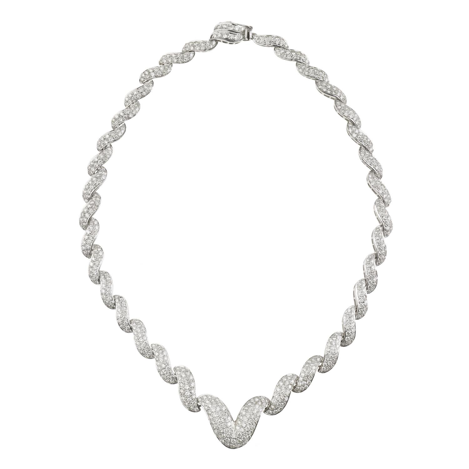 montatura semirigida a maglie sagomate decorate in pavé di diamanti poste in gradazione a formare un motivo torchon, diamanti per ct 10.5 circa, g 48