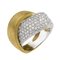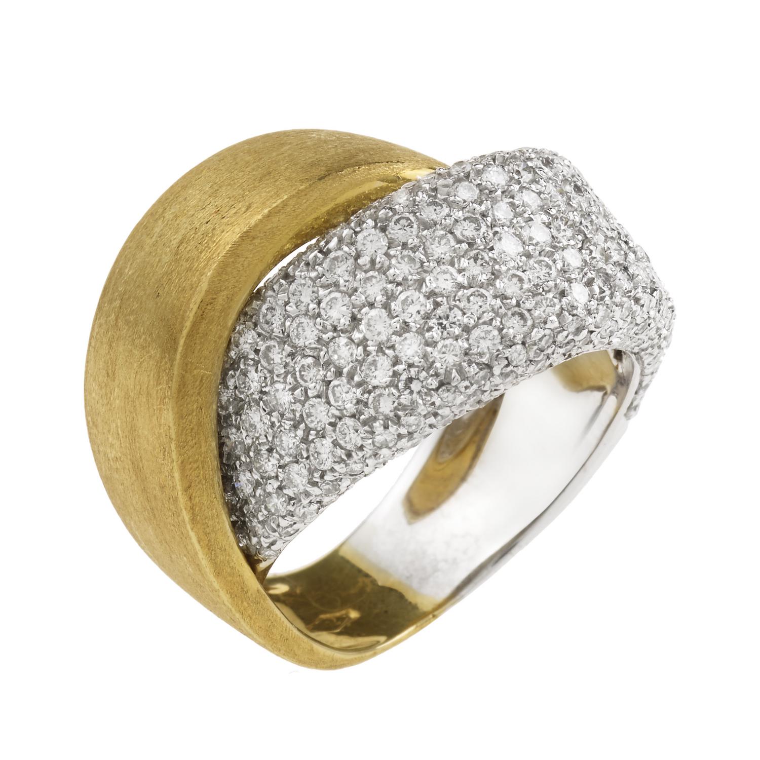 modellato a due fasce intersecanti fra loro, rispettivamente una in oro bianco e pavé di diamanti per ct 1.50 circa, ed una in oro giallo satinato, punzone 750, mis 14, g 14,7