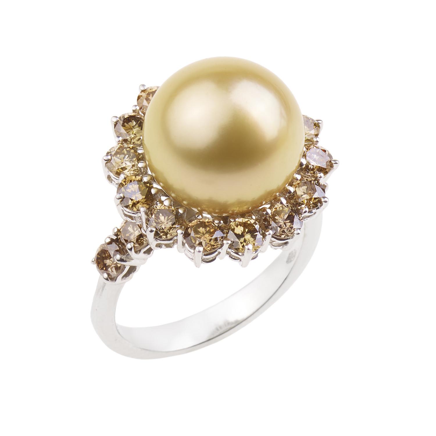 ANELLO IN ORO BIANCO, PERLA SOUTH SEA GOLD E DIAMANTI FANCY