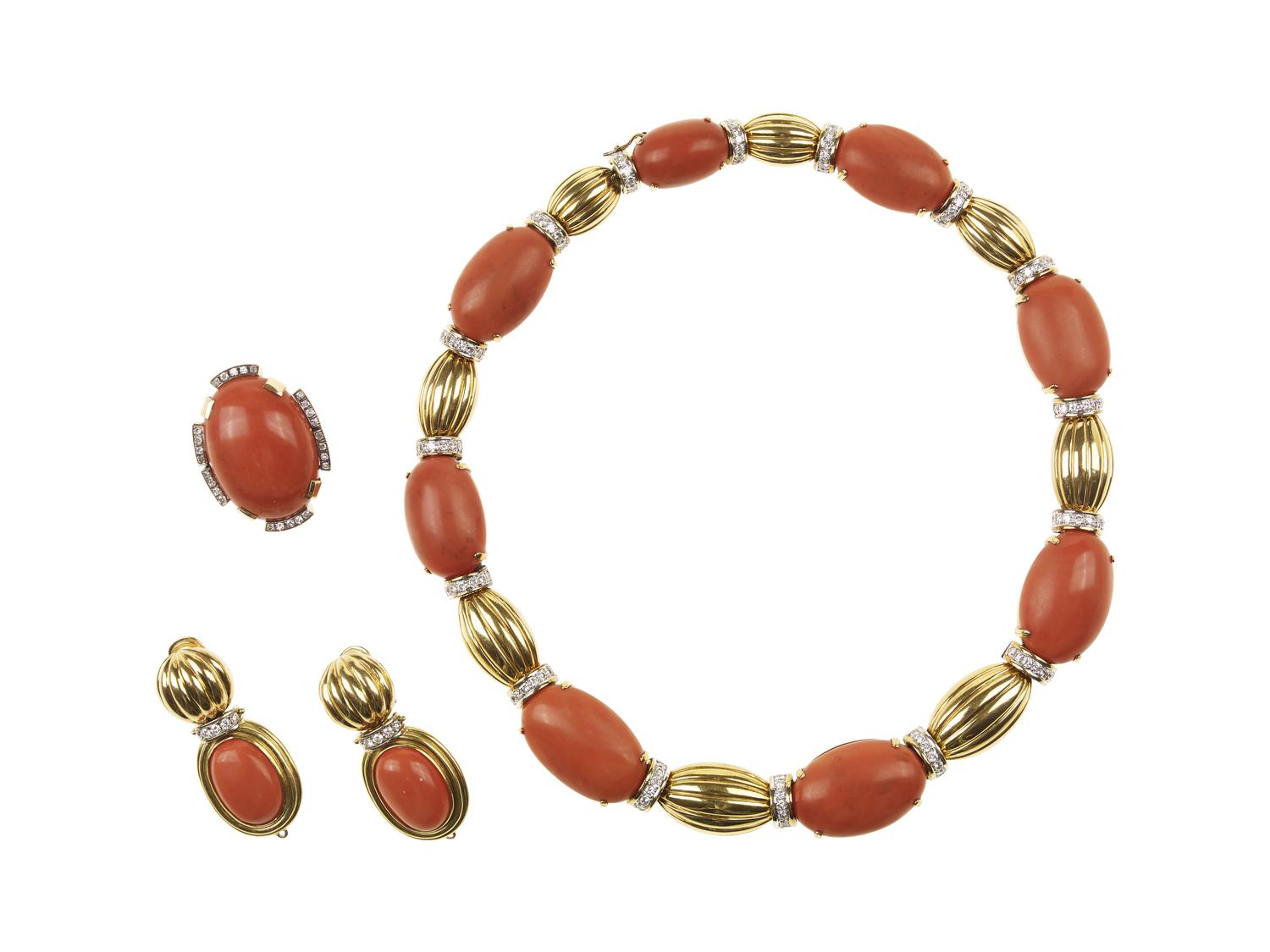 PARURE IN ORO GIALLO, CORALLO E DIAMANTI