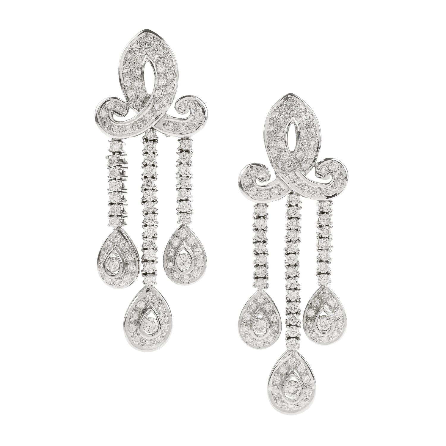 ciascuno disegnato come una doppia voluta traforata in pavé di diamanti a cui sono sospese tre linee digradanti di diamanti taglio brillante con finali a goccia per complessivi ct 4,5 circa, punzone 750, lung cm 5,5, g 25