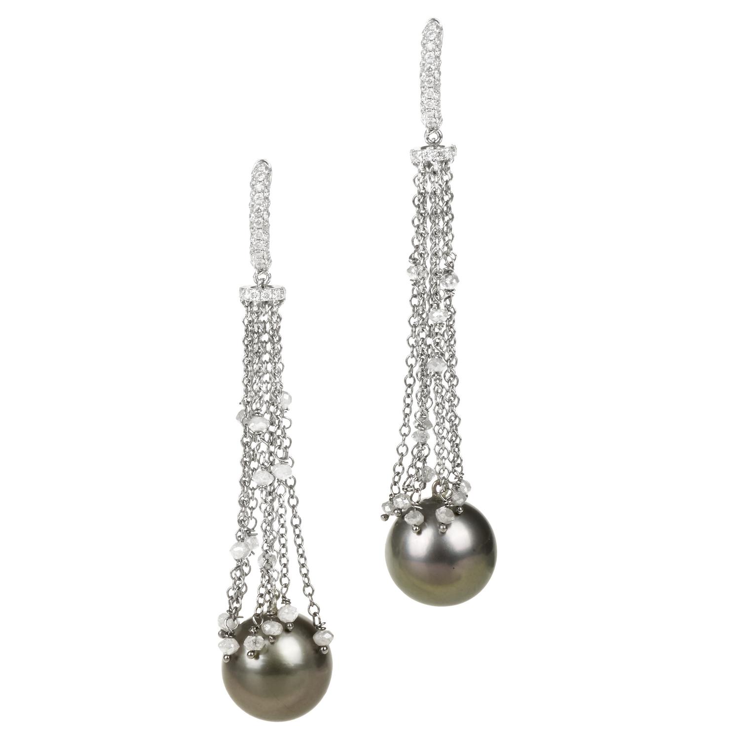 montatura a monachella in pavé di diamanti decorata da una serie di catene pendenti a maglia sottile e diamanti a rondelle per ct 3,37 circa a cui sono sospese due perle south sea grigie di mm 12-12,5, lung cm 5,5, g 9,4