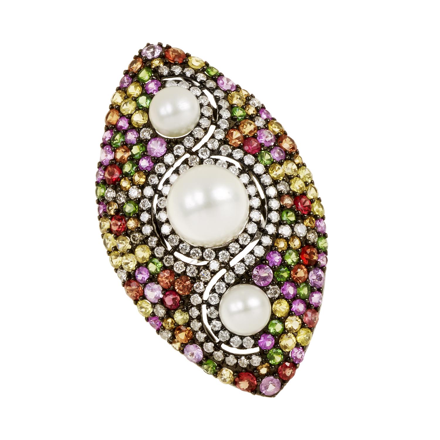 realizzato in oro bianco e oro brunito, al centro tre perle coltivate mm 7-9, contorno in zaffiri multicolor per ct 4.06 circa, diamanti per ct 0.84 circa e tzavoriti per ct 0.61, punzone 750, mis 13,5, g 10,5