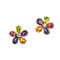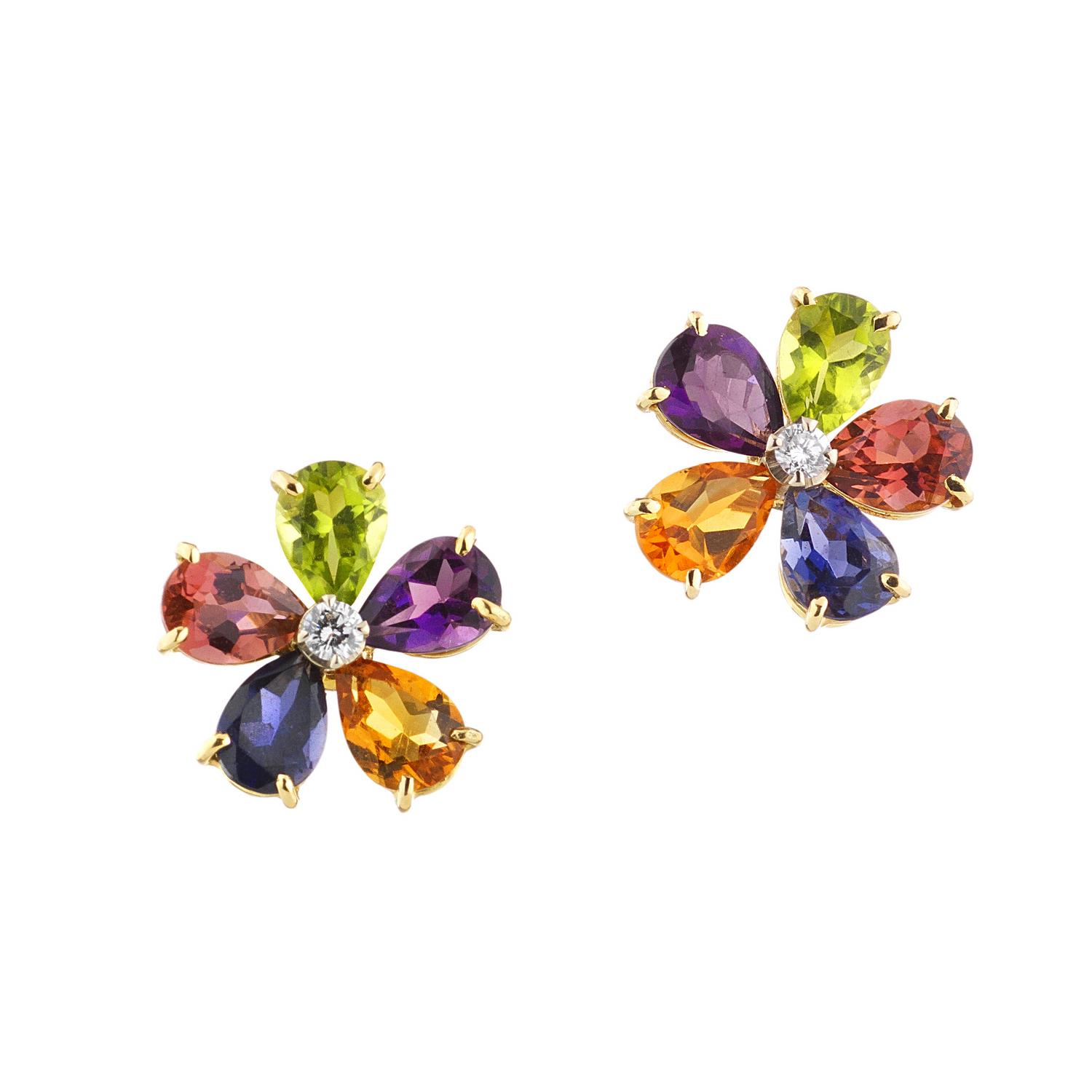 ciascuno disegnato come una corolla polilobata formata da pietre semi-preziose taglio goccia, il pistillo in diamante taglio brillante rotondo per complessivi ct 0.12 circa, punzone 750, diametro cm 1,5, g 6 circa