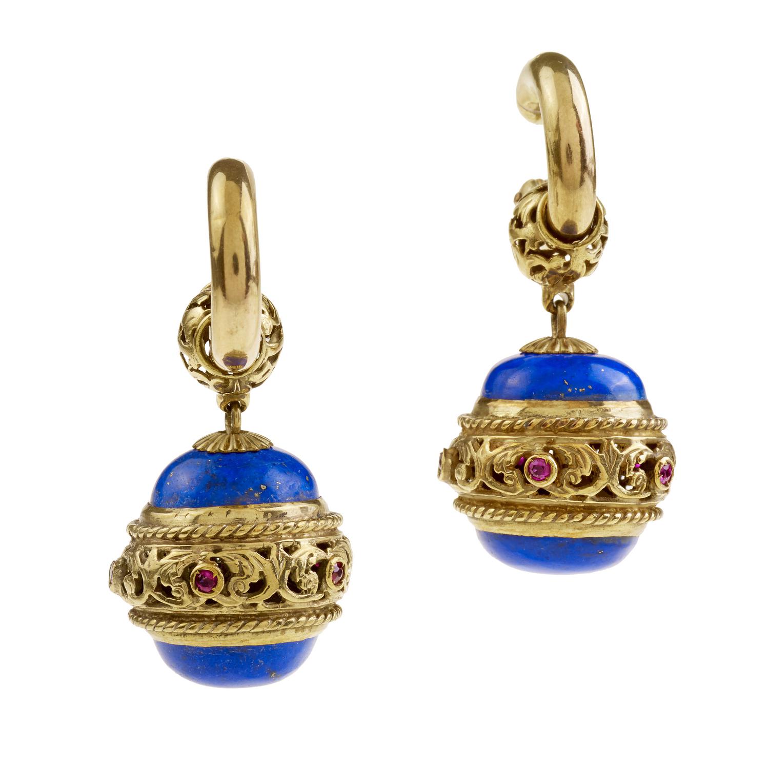 LAPISLAZZULI, RUBY AND 9 KT YELLOW GOLD PENDANT EARRINGS