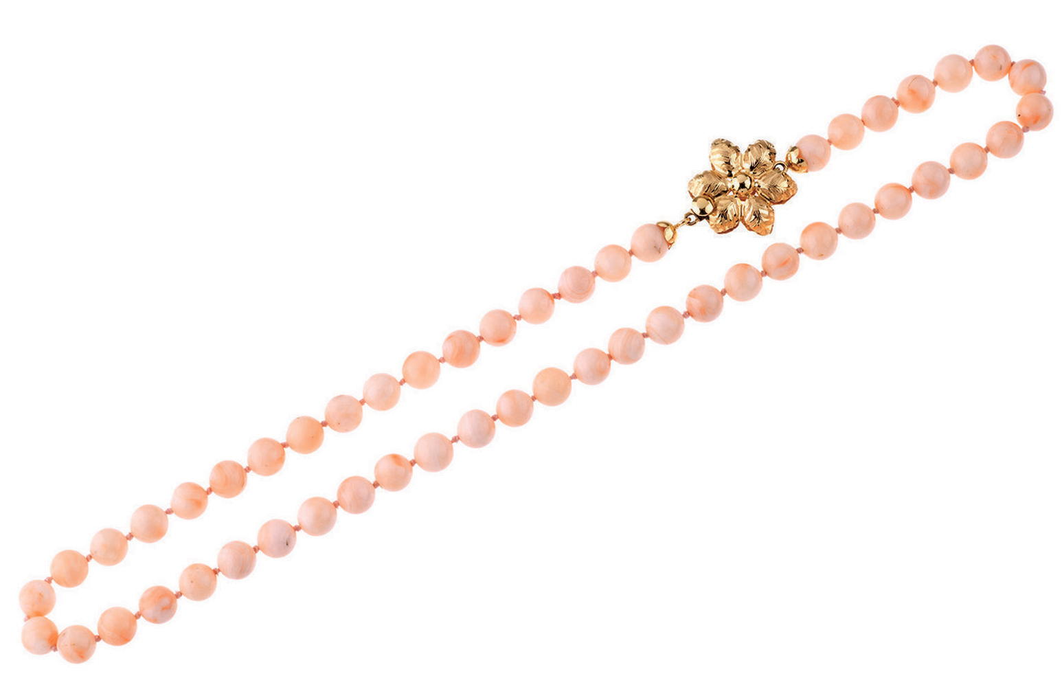 realizzata ad una fila di sferette in corallo rosa chiaro diametro mm 8,5, fermatura in oro giallo modellata a corolla, punzone 750, lung cm 52, g 51