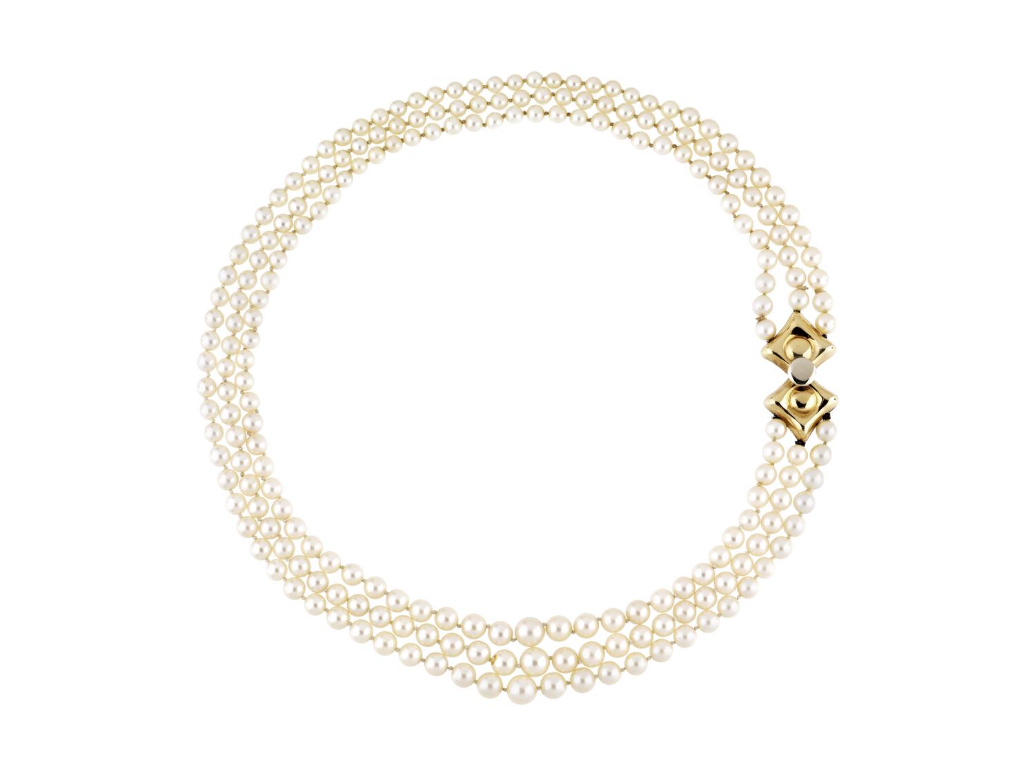 realizzata a tre fili di perle mm 5-8, fermatura in oro giallo e bianco, lung cm 51, g 72,6