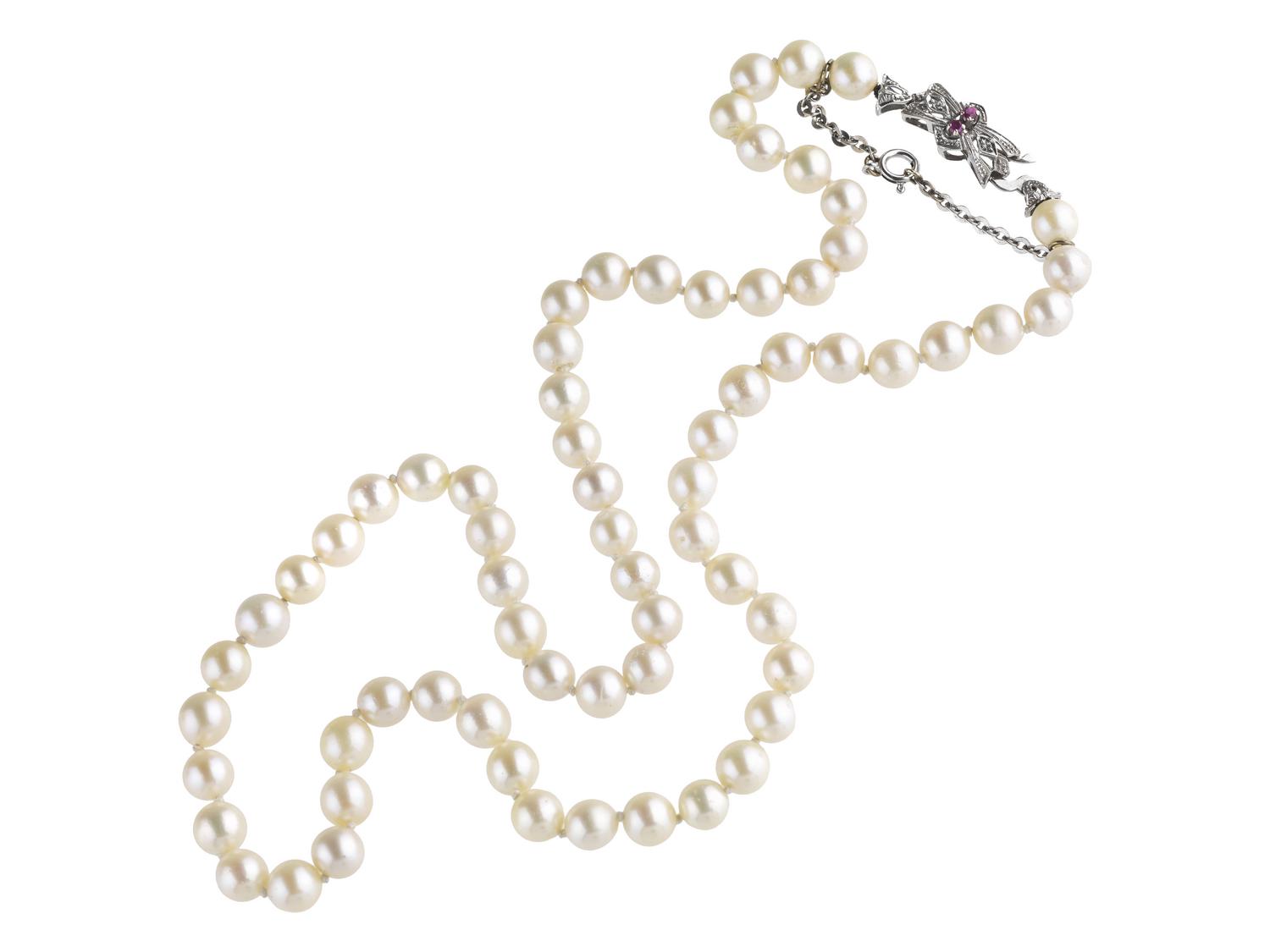 realizzata ad un filo di perle diametro mm 7 -7,5, fermatura in oro bianco traforato a fiocco e decorato da piccoli rubini, punzone 750, lung cm 60, g 49