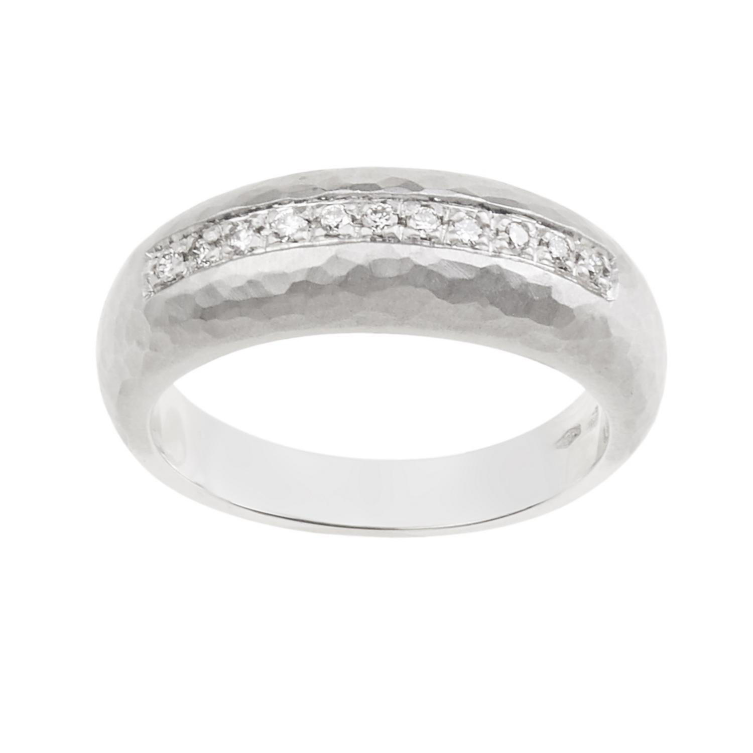 la parte superiore satinata e battuta a mano, al centro una linea di diamanti per ct 0.10 circa, punzone 750, mis 14, g 7