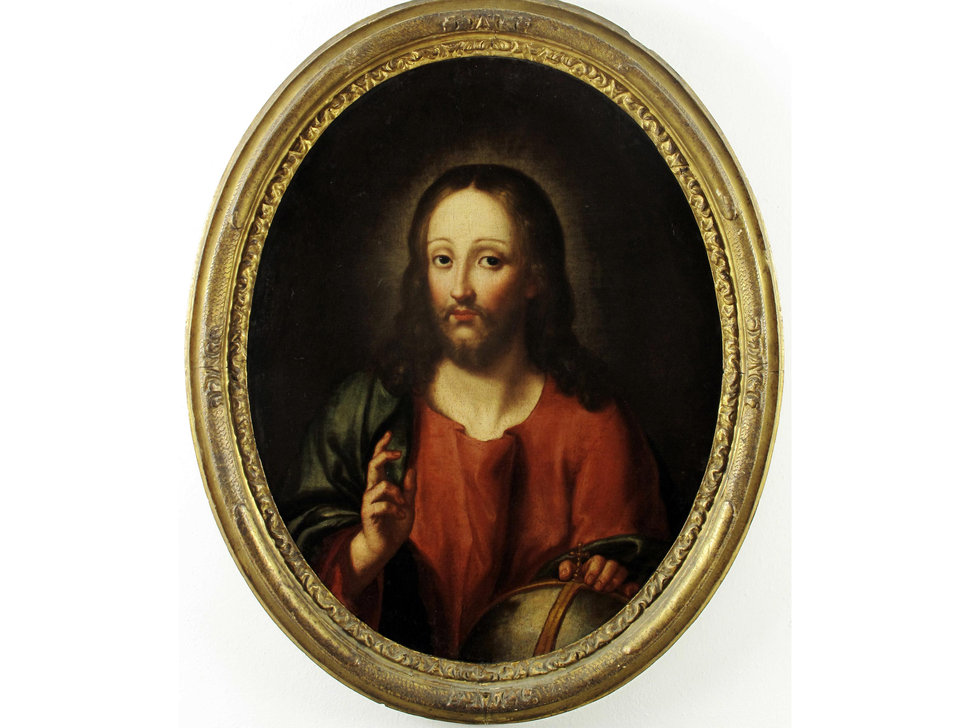 Italia settentrionale (XVII secolo) Salvator Mundi Olio su tela Cornice coeva Misure senza cornice 71x54 cm