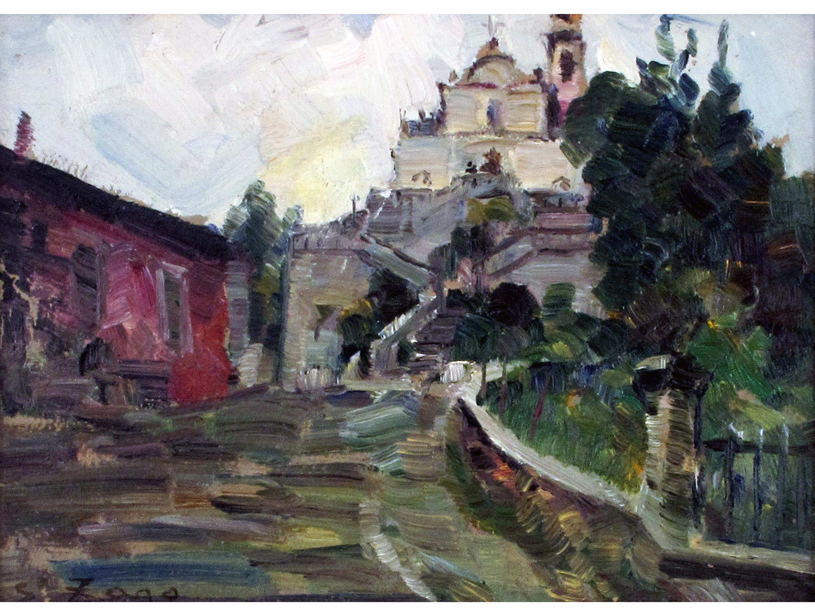 Erma Zago (Bovolone 1880 - Milano 1942) Strada verso il santuario Olio su cartoncino Firmato Misure 19x26.4 cm