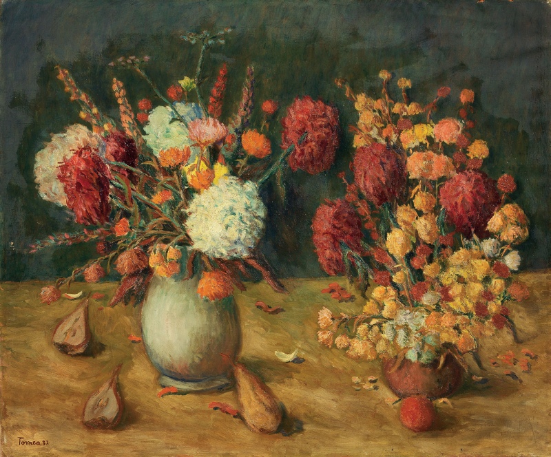 Fiorenzo Tomea Zoppè di Cadore (Bl) 1910 - Milano 1960 Natura morta, 1937 Olio su tela, cm. 75,5x90,5 Firma e data in basso a sinistra: Tomea 37. Al verso sulla tela: timbro Galleria d'Arte Sianesi, Milano.