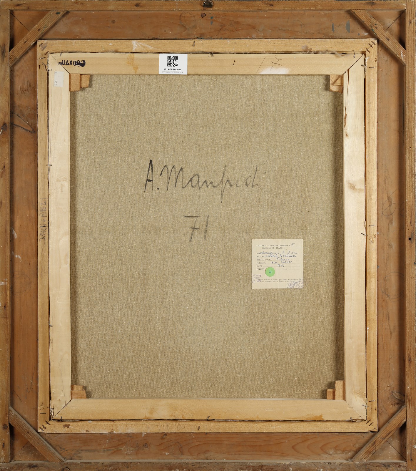 MANFREDI ALBERTO (1930 - 2001) Senza titolo. 1971. Olio su tela . Cm 60,00 x 70,00. Firma in basso a sinistra. Al retro firma, anno e cartiglio descrittivo Galleria d'arte Metastasio, Prato. Cornice presente