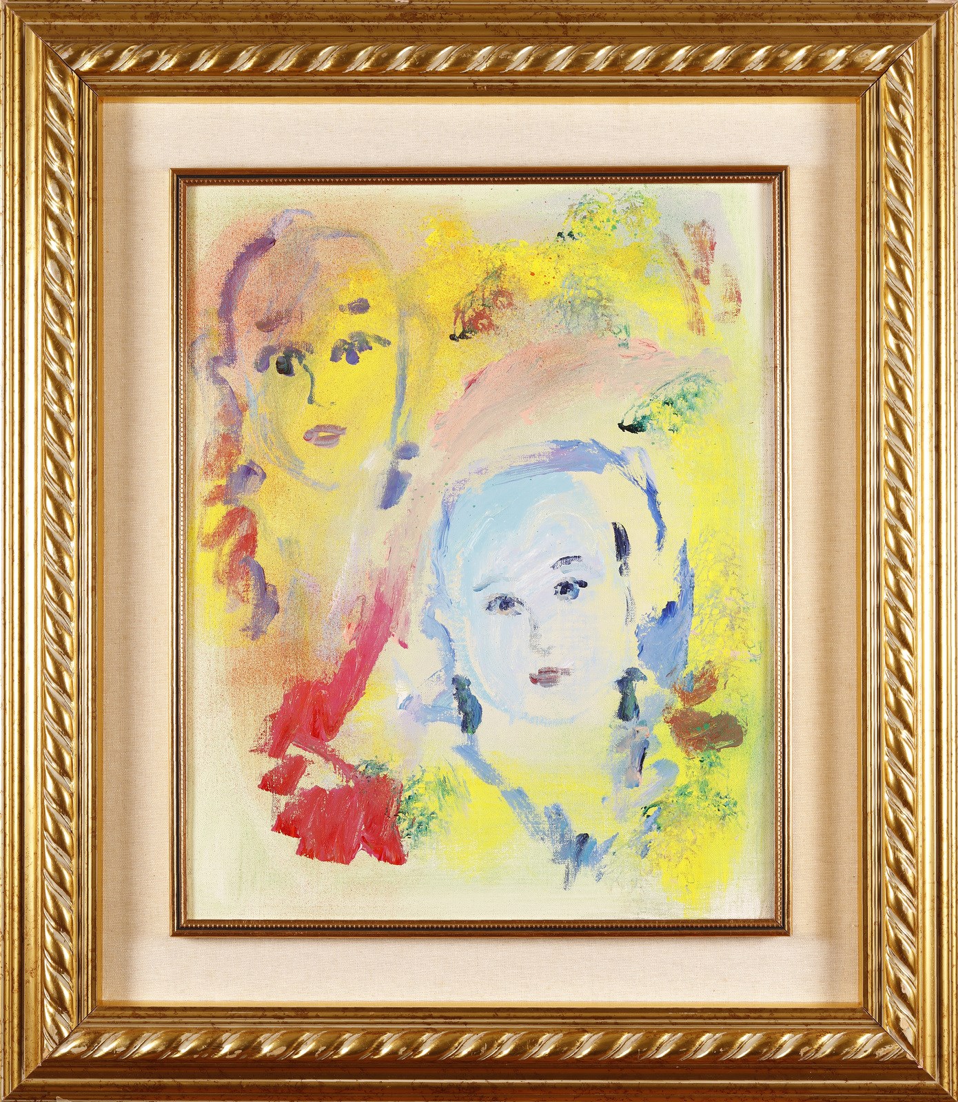 TRECCANI ERNESTO (1920 - 2009) Volti tra i fiori. Olio su tela . Cm 40,00 x 50,00. Firma al retro. Autentica dell'artista su fotografia. Certificato di provenienza Casa delle Aste Meeting Art, Vercelli. Cornice presente