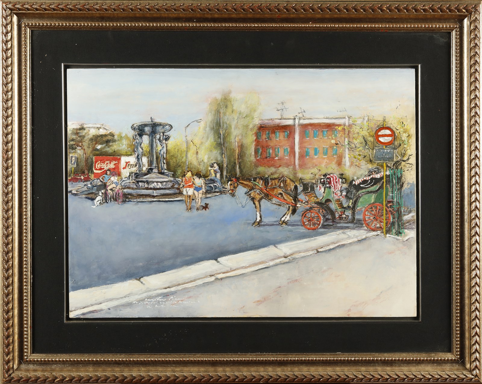 PIACESI WALTER (n. 1929) Nei pressi del vecchio kursaala cattolica. Olio su tavola. Cm 70,00 x 50,00. Firma in basso a sinistra. Al retro titolo e firma. Autentica dell'artista su fotografia. Cornice presente