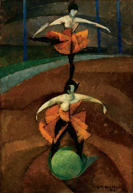 Roberto Marcello (Iras) Baldessari Innsbruck 1894 - Roma 1965 Circo. Equilibrismo di ballerine, 1919 Olio su cartone, cm. 69,5x47,5 Firma e data in basso a destra: R.M. Baldessari / -1919-. Storia Collezione Peron; Collezione privata Certificato con foto Archivio Unico per il Catalogo delle Opere Futuriste di Roberto Marcello Baldessari, Rovereto, 12 maggio 2011, con n. B19-61. Esposizioni Firenze-New York. Rinascimento e Modernità. Da Luca Signorelli a Andy Warhol, Firenze, Galleria d'Arte Frediano Farsetti, 30 settembre - 10 dicembre 2011, cat. n. 15, illustrato a colori.