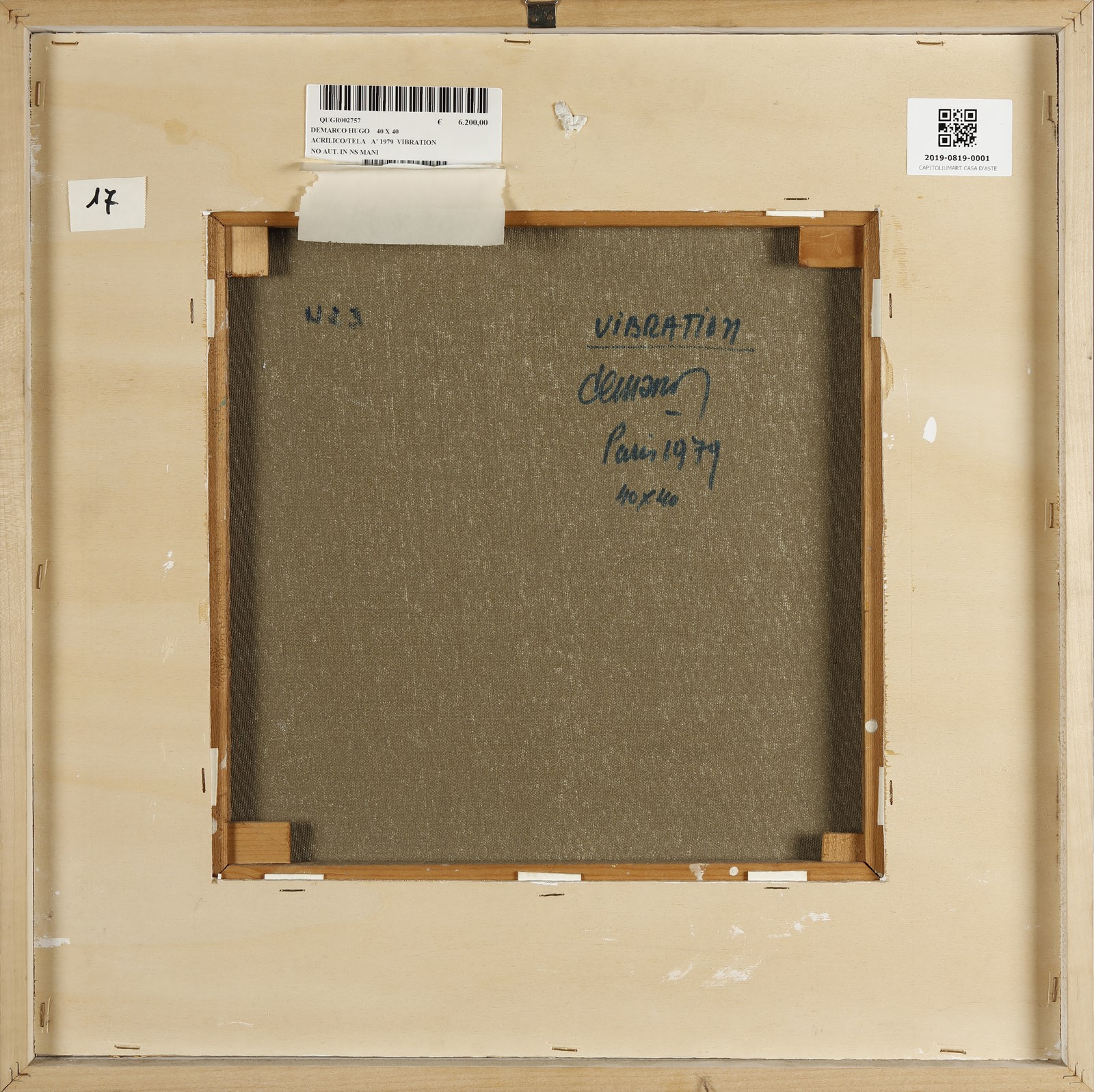 DEMARCO HUGO (1932 - 1995) Vibration. 1979. Acrilico su tela. Cm 40,00 x 40,00. Al retro titolo, firma e anno. Autentica dell'artista su fotografia. Certificato di garanzia Starmarket, Assago. Cornice presente