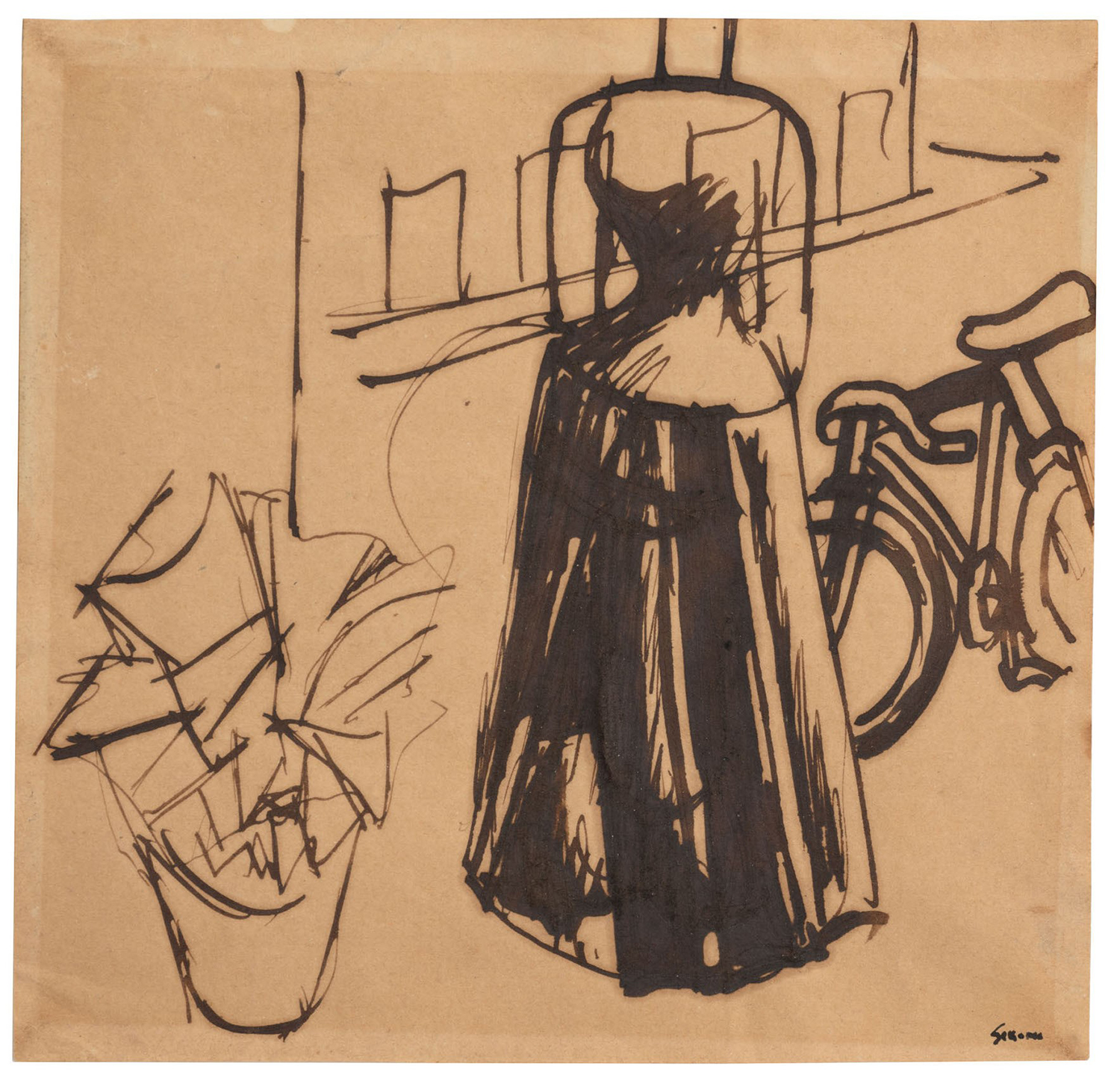 Mario Sironi (1885-1961) Figura femminile con casa, bicicletta e pianta, 1919 ca; inchiostro su carta, cm 13,2x13,5