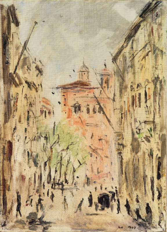 Filippo de Pisis Ferrara 1896 - Milano 1956 Il Foro Bonaparte a Milano, 1941 Olio su tela, cm. 70x50 Firma in basso a destra: de Pisis. Al verso sulla tela: timbro e etichetta con n. 4136 Galleria dell'Annunciata, Milano. Storia Galleria dell'Annunciata, Milano; Collezione Mazzotta, Milano; Collezione privata, Firenze Esposizioni Omaggio a Filippo de Pisis, Cortina d'Ampezzo, Galleria Dolomiti, 25 dicembre 1967 - 10 gennaio 1968, cat. tav. XVII, illustrato; 100 opere di Filippo de Pisis, Prato, Galleria d'Arte Moderna Falsetti, 19 maggio - 19 giugno 1973, cat. tav. LXXXII, illustrato a colori; Filippo de Pisis, venti opere vent'anni dopo, Focette, Galleria d'Arte Moderna Falsetti, cat. n. 16, illustrato. Bibliografia Giuseppe Raimondi, Filippo De Pisis, Vallecchi Editore, Firenze, 1952, tav. 102; Giuliano Briganti, De Pisis. Catalogo generale, tomo secondo, opere 1939-1953, con la collaborazione di D. De Angelis, Electa, Milano, 1991, p. 538, n. 1941 14. Rintelato.