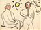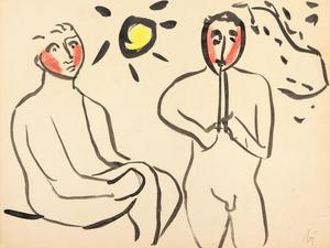 Enrico Baj Milano 1924 - Vergiate (Va) 2003 Due figure, (1954) Inchiostro e pastello su carta, cm. 26,5x35 Firma in basso a destra: Baj. Al verso altra composizione, Figura, con firma e data in basso a destra: Baj / 54. Foto autenticata dall'artista. Studio per il De Rerum Natura.