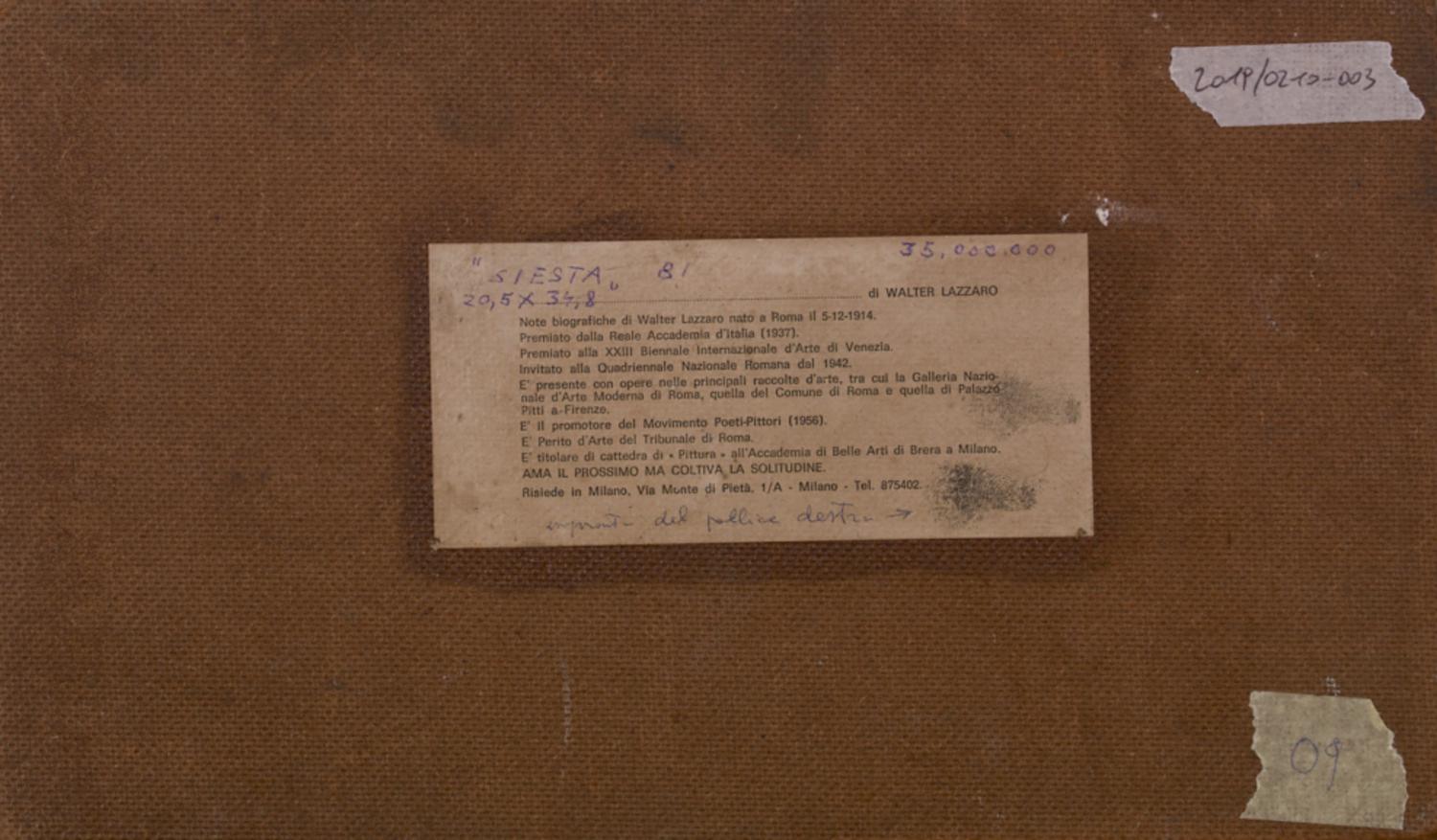 sul retro: titolo e data; etichetta dello studio dell'artista