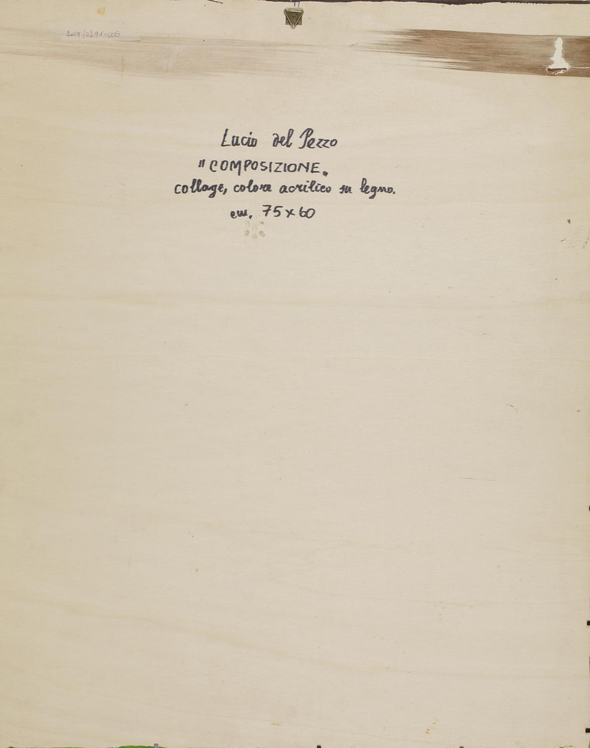 Lucio Del Pezzo COMPOSIZIONE collage e acrilico su legno, cm 75x60 firma sul...