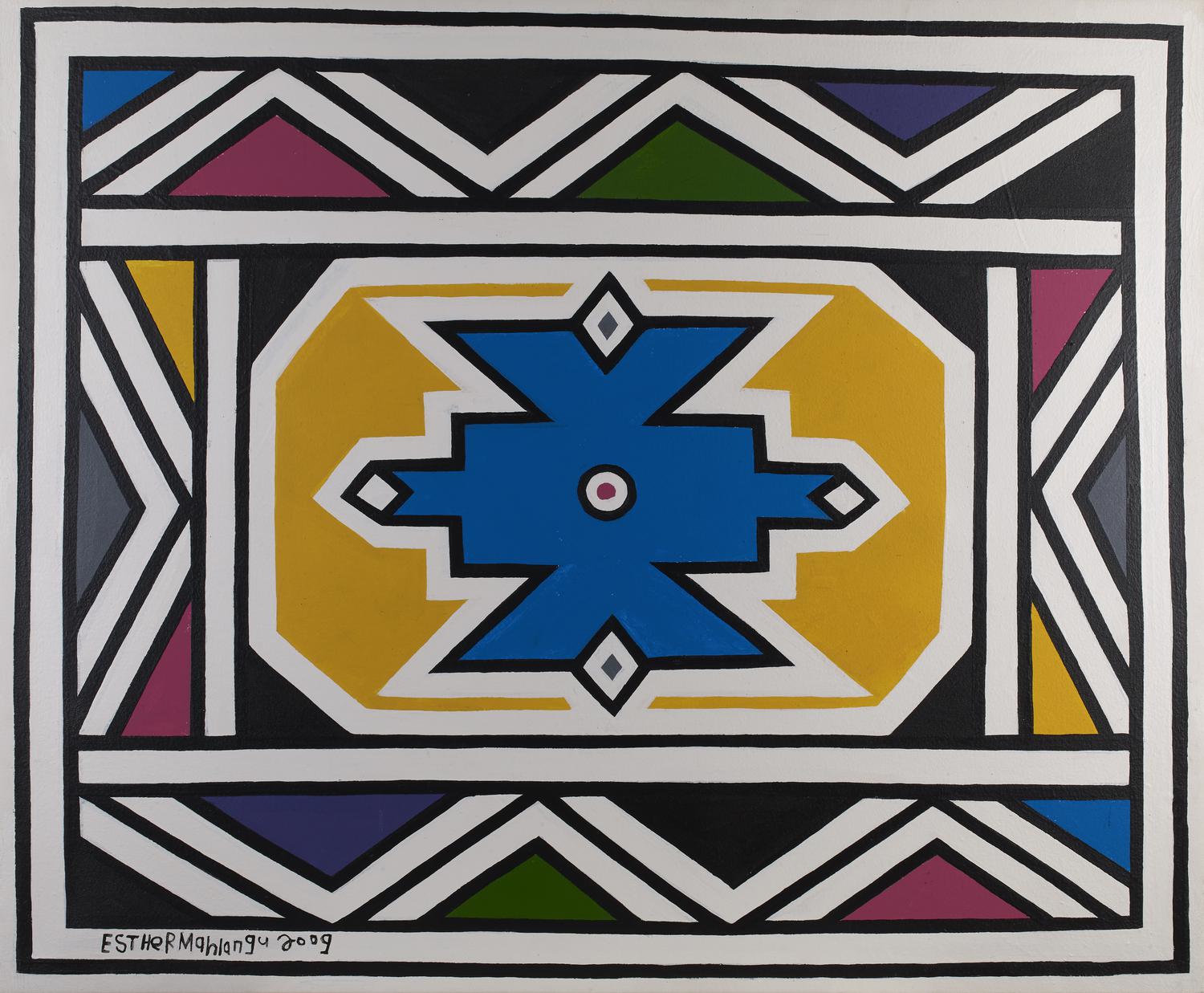 Esther Mahlangu COMPOSIZIONE acrilico su tela, cm 92x112 firma e data...