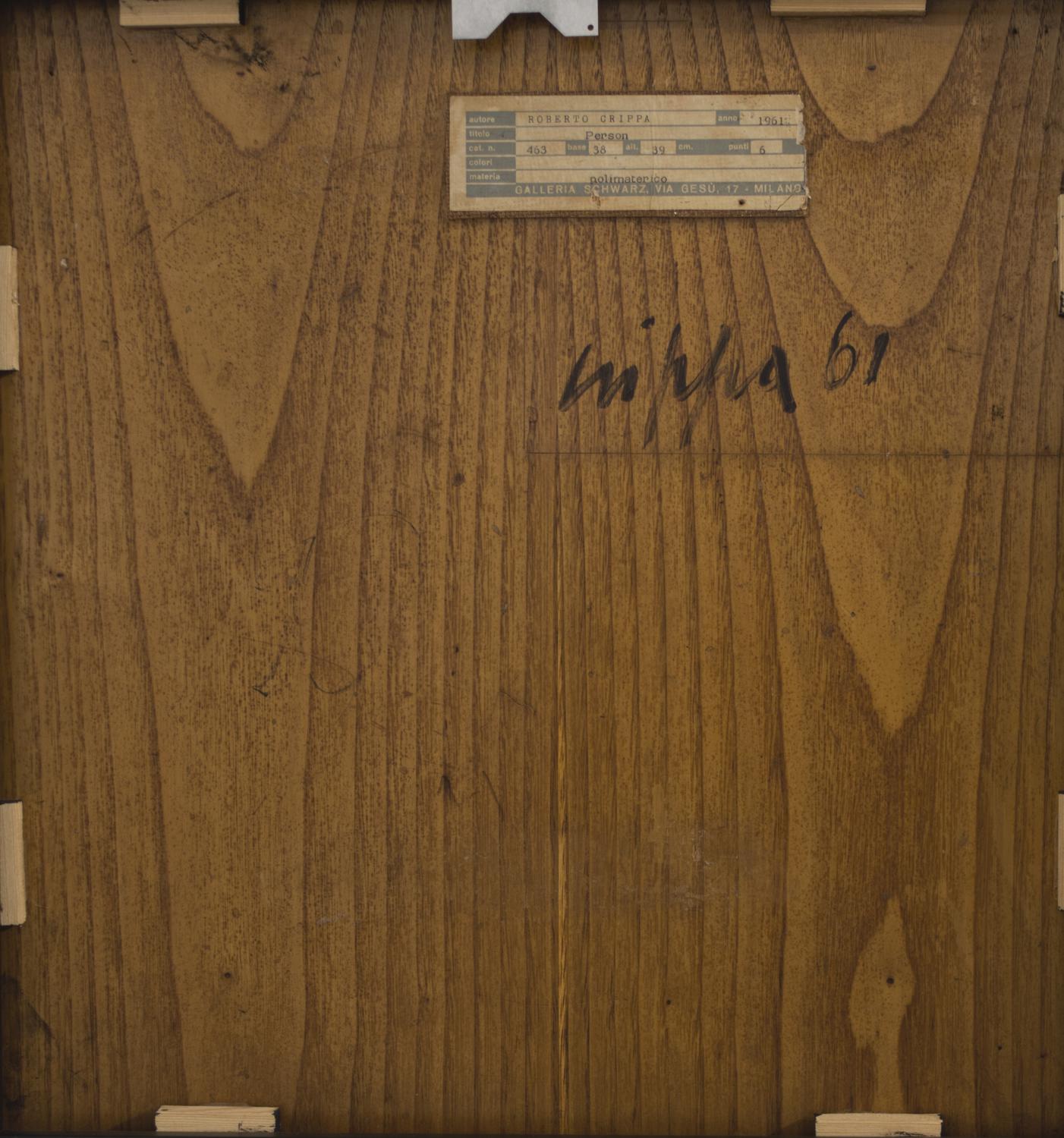 Roberto Crippa PERSON legno, giornali e cera su tavola, cm 42,5x41,5 sul...