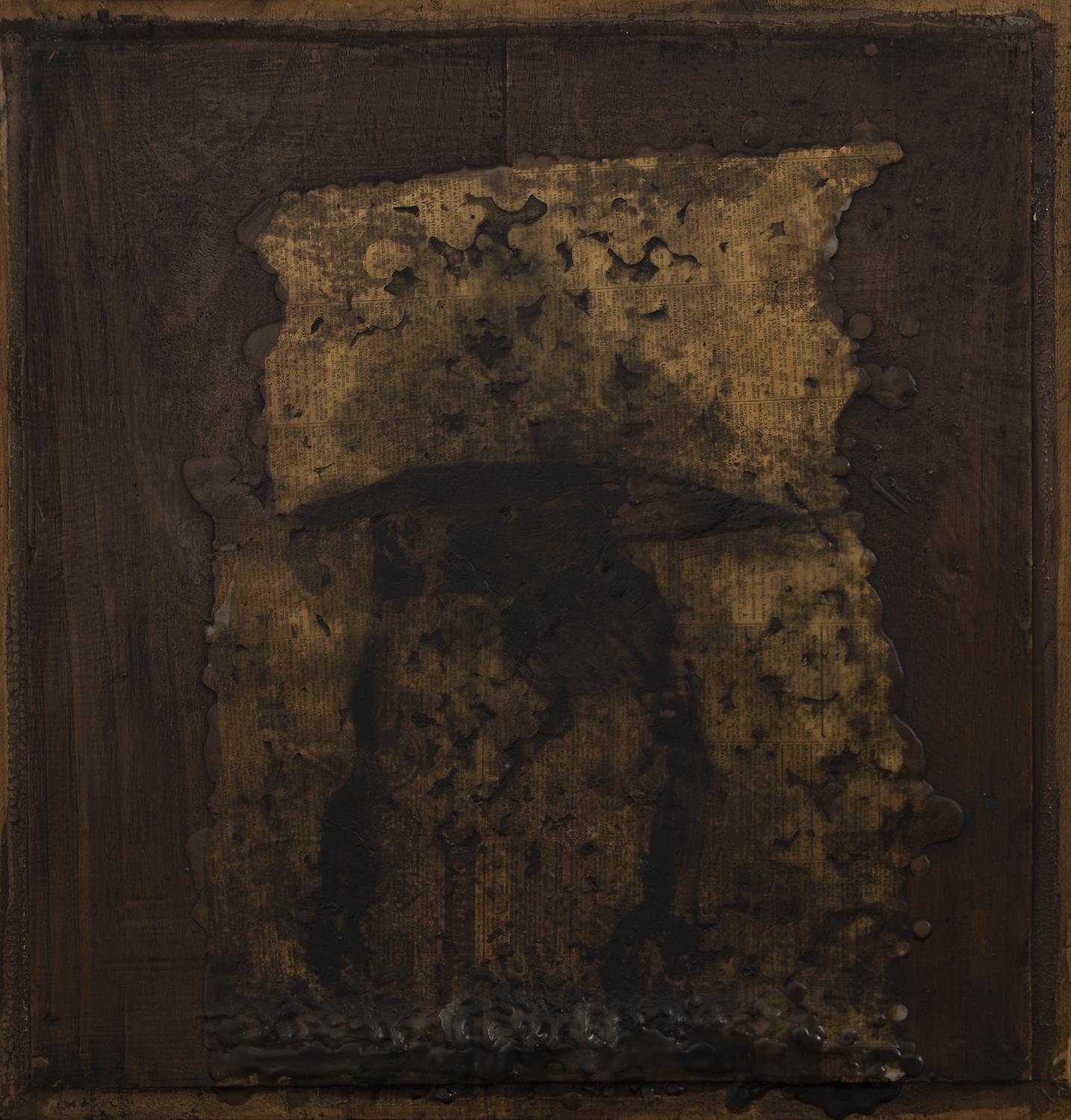 legno, giornali e cera su tavola, cm 42,5x41,5