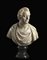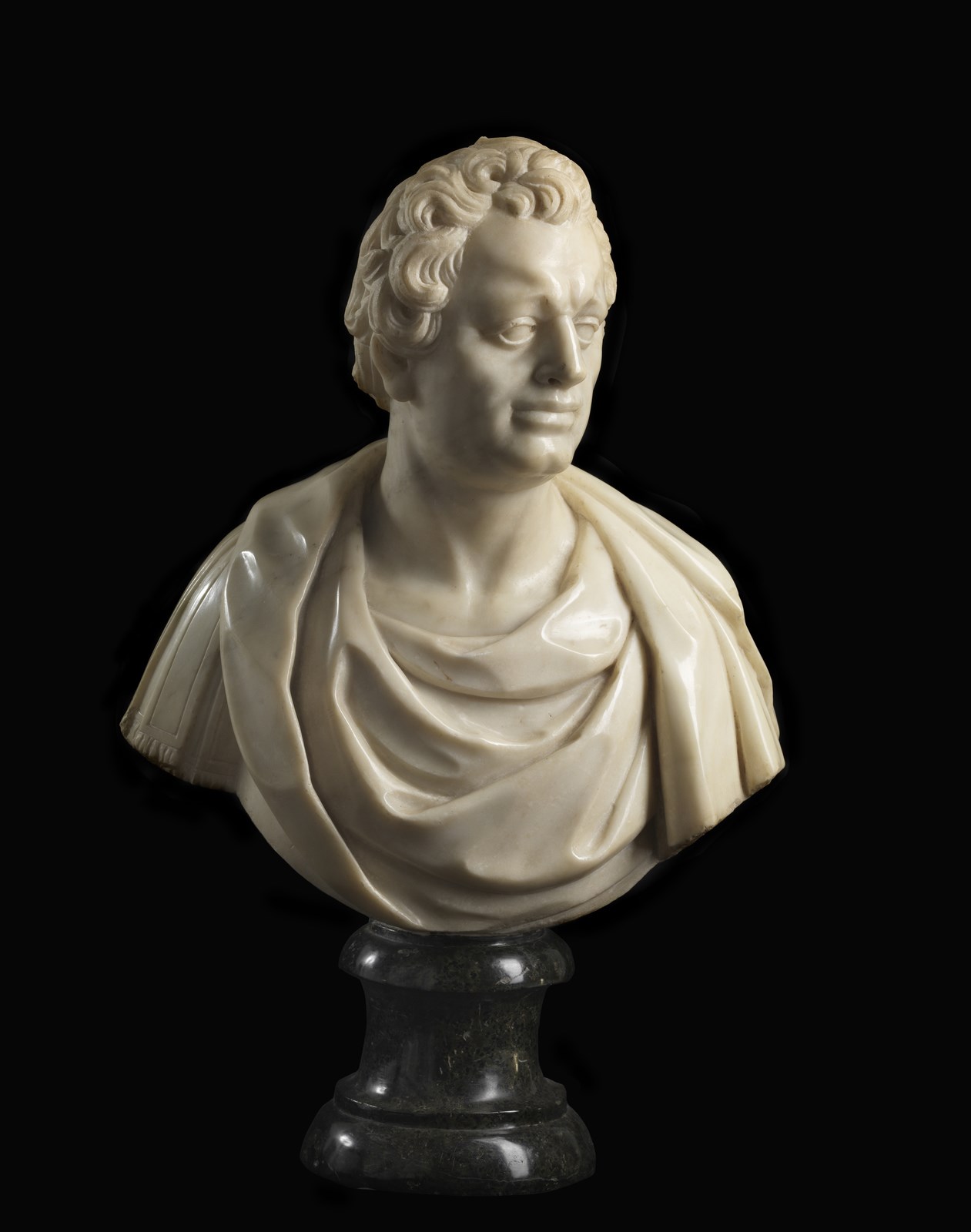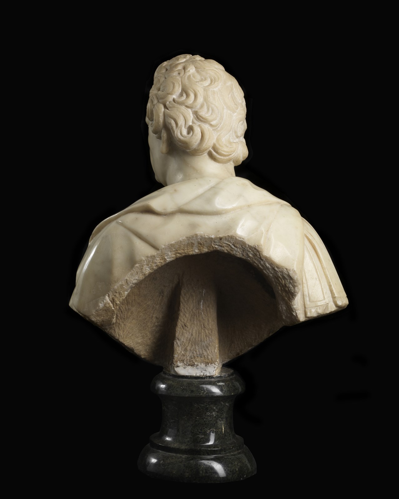 ARTISTA DEL XVII SECOLO Condottiero. . Marmo. Cm 40,00 x 65,00. Il busto maschile è ritratto nella posa del condottiero come si evince dal drappeggio del mantello che ricorda il paludamentum dei comandanti romani tra cui gli imperatori, così come dal pteryx ( frangia in pelle) dell'armatura che si vede sulla spalla destra. Paludamentum e pteryx erano adottati e ampiamente usati quali simbolo di potenza militare fin dai tempi dell'antica Roma.