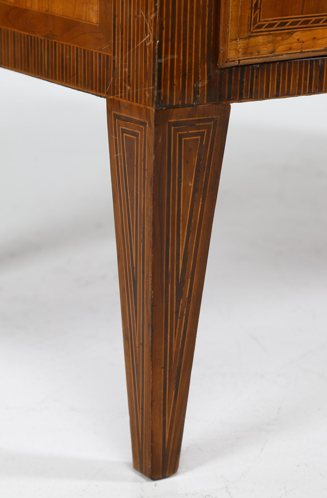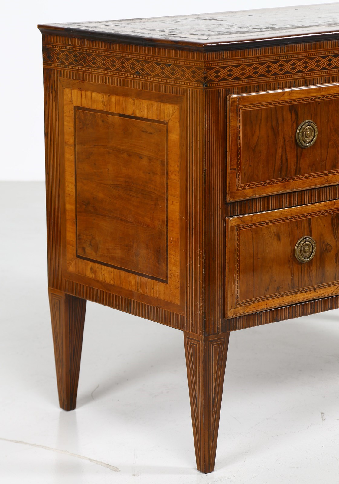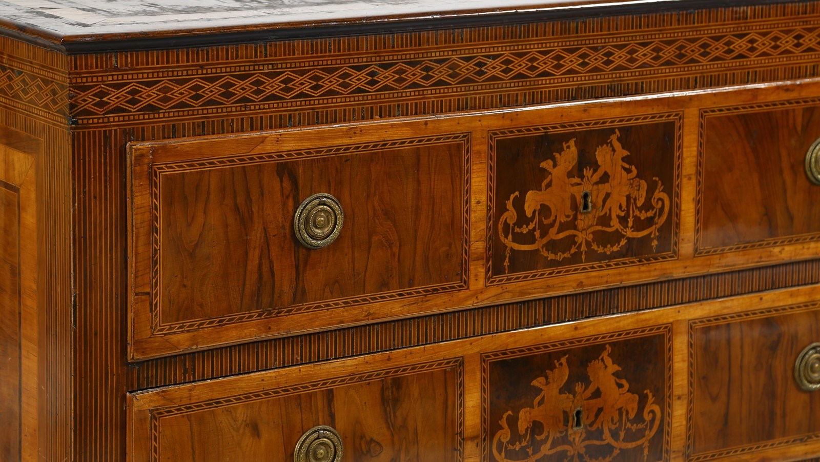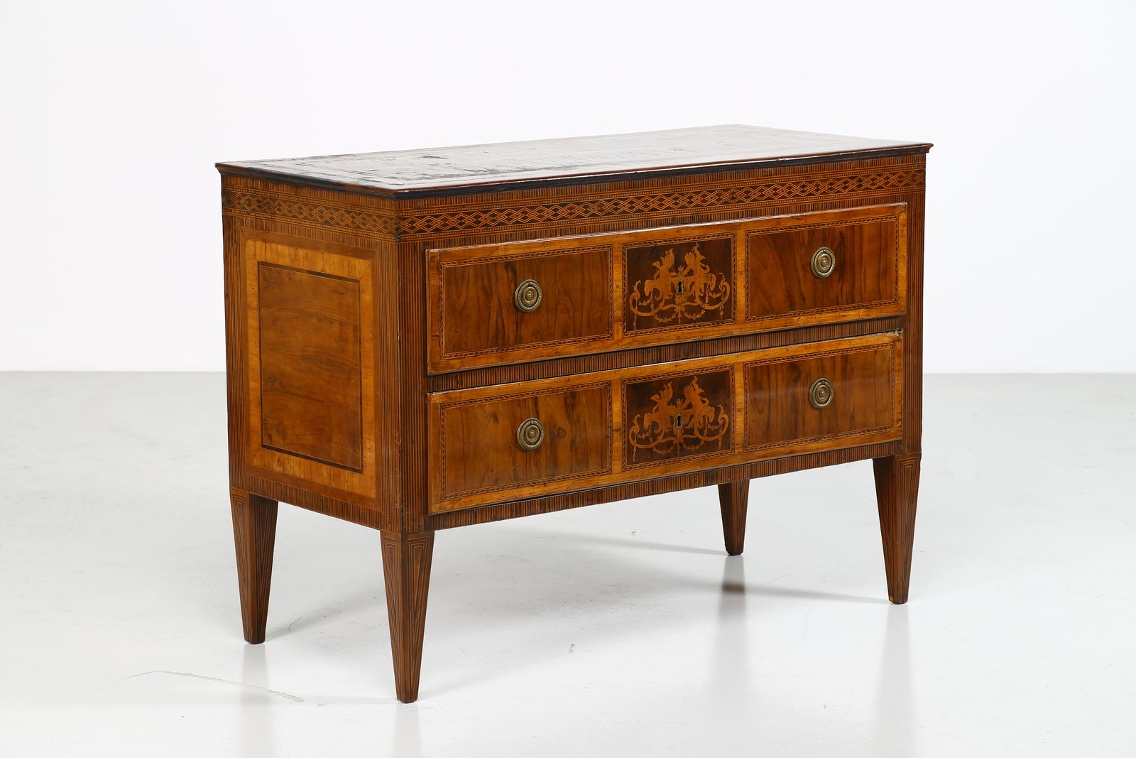 Lot 56 | MANIFATTURA ITALIANA DEL XVIII SECOLO Cassettone intarsiato in legni esotici a due cassetti centrati da riserve decorate a festoni e putti, decorazioni geometriche sulla fascia superiore.