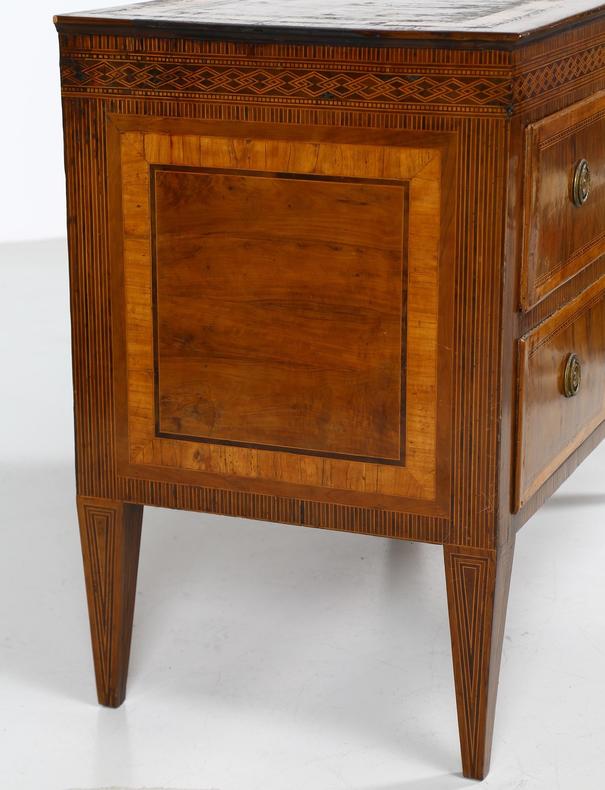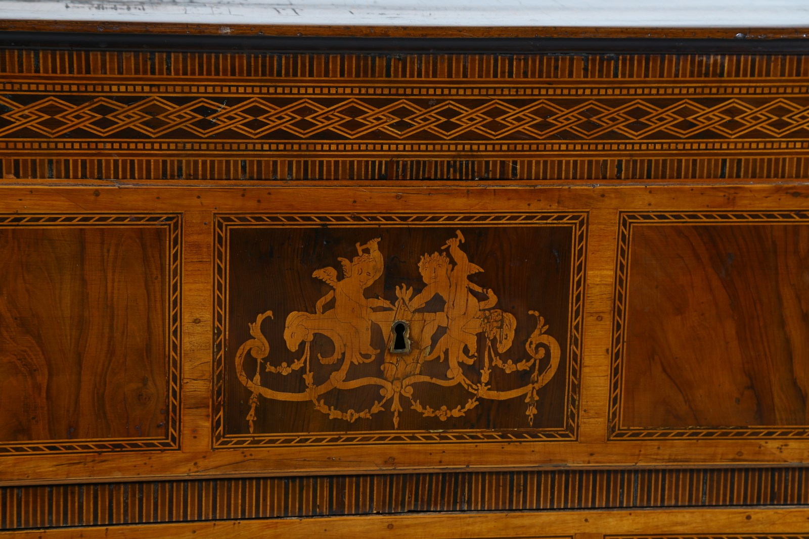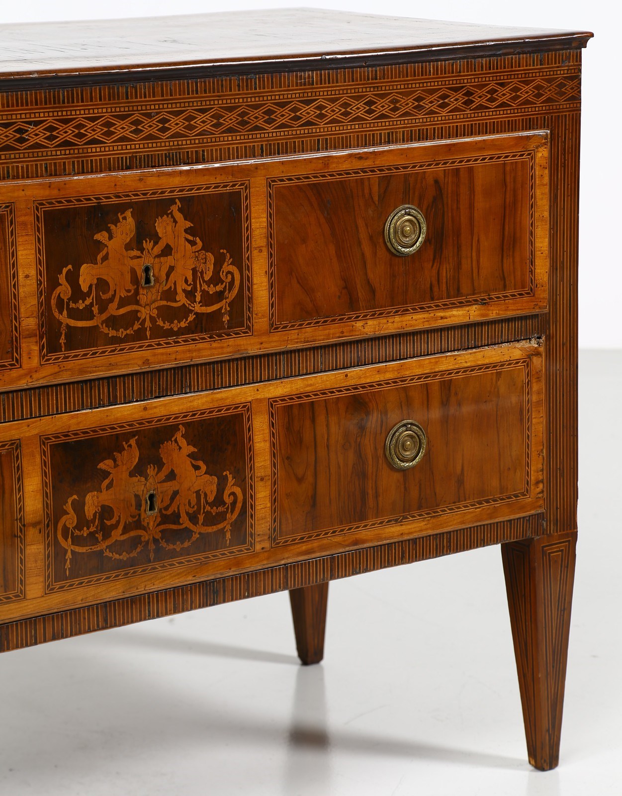MANIFATTURA ITALIANA DEL XVIII SECOLO Cassettone intarsiato in legni esotici a due cassetti centrati da riserve decorate a festoni e putti, decorazioni geometriche sulla fascia superiore.