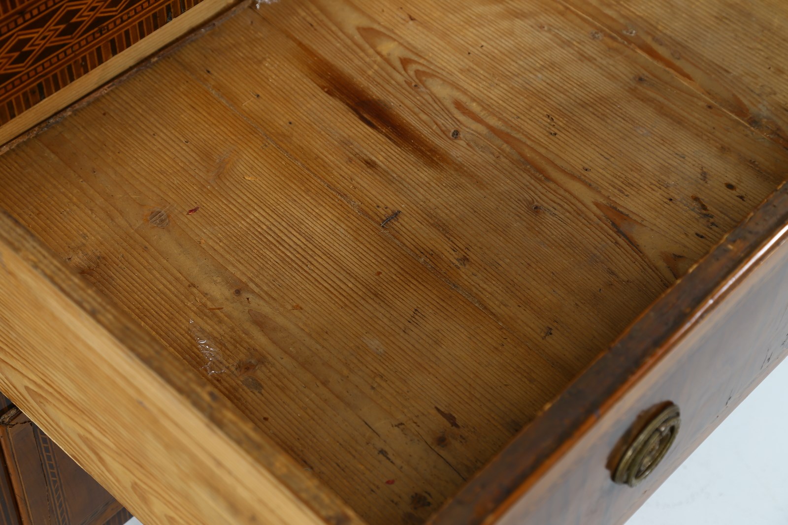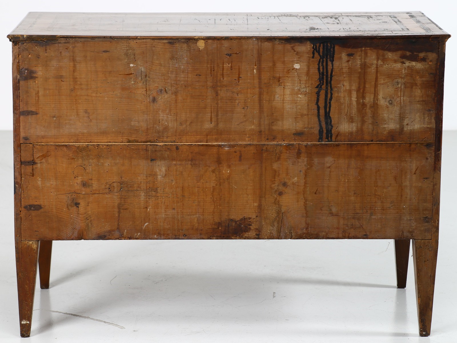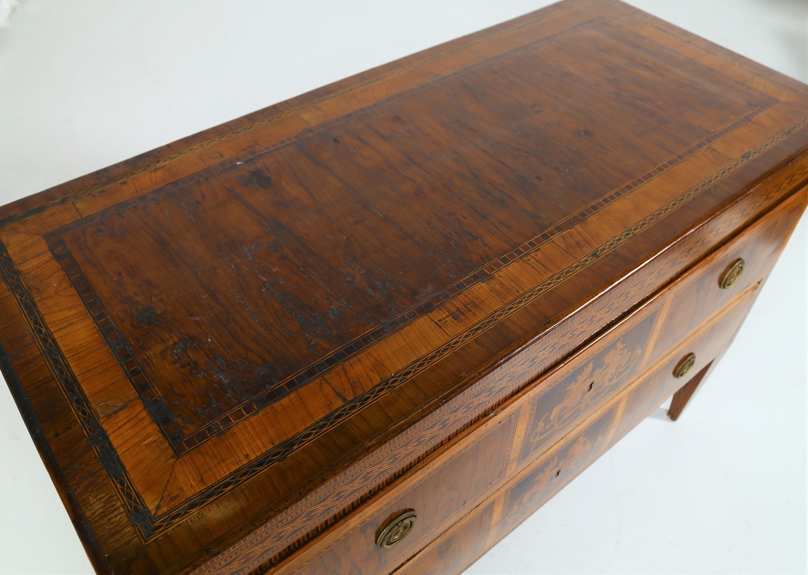 MANIFATTURA ITALIANA DEL XVIII SECOLO Cassettone intarsiato in legni esotici a due cassetti centrati da riserve decorate a festoni e putti, decorazioni geometriche sulla fascia superiore.