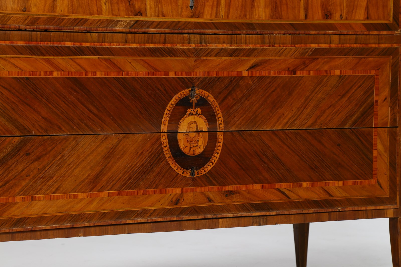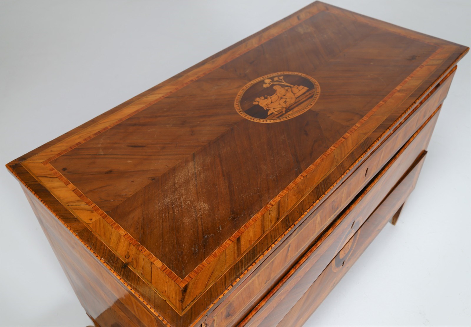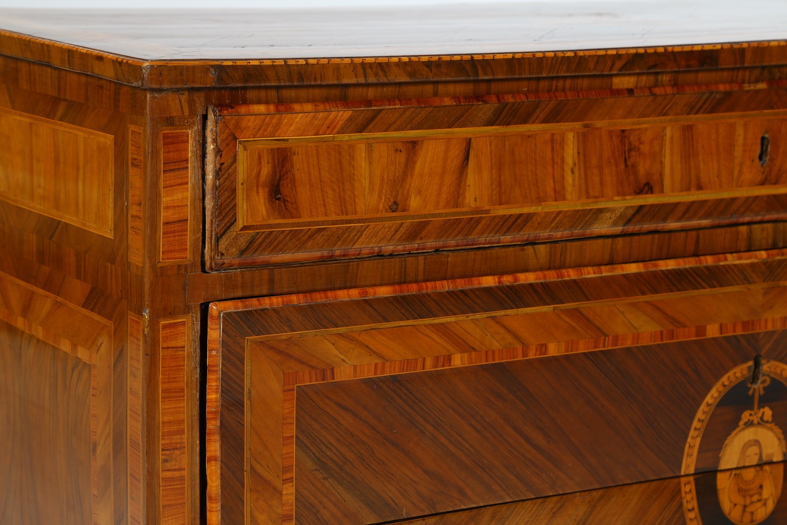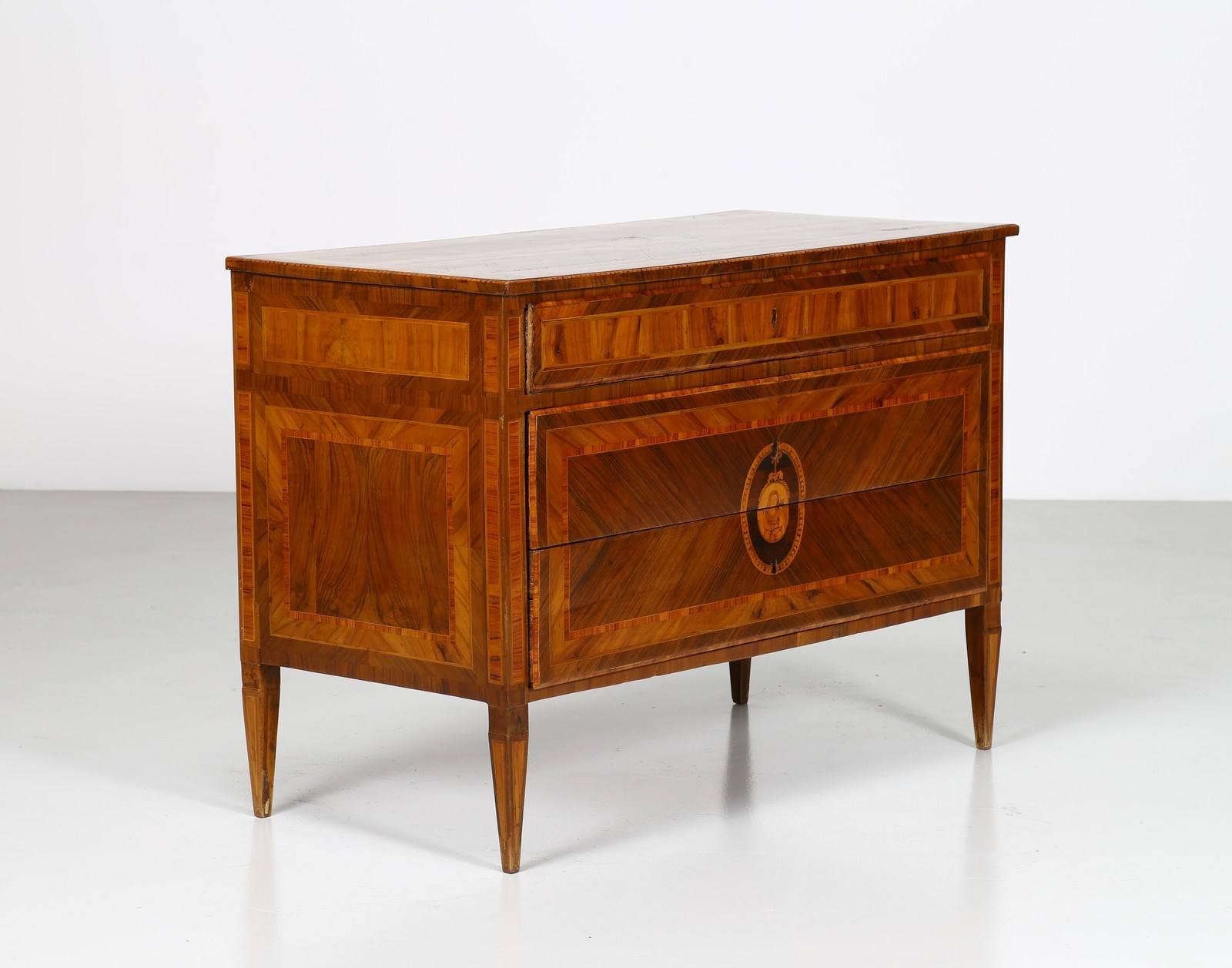 MANIFATTURA LOMBARDA DEL XVIII SECOLO Cassettone a tre cassetti in noce intarsiato in legni di essenze pregiate, fronte e fianchi dritti, decori figurativi entro riserve circolari sul fronte e il piano, gambe troncopiramidali.