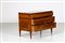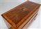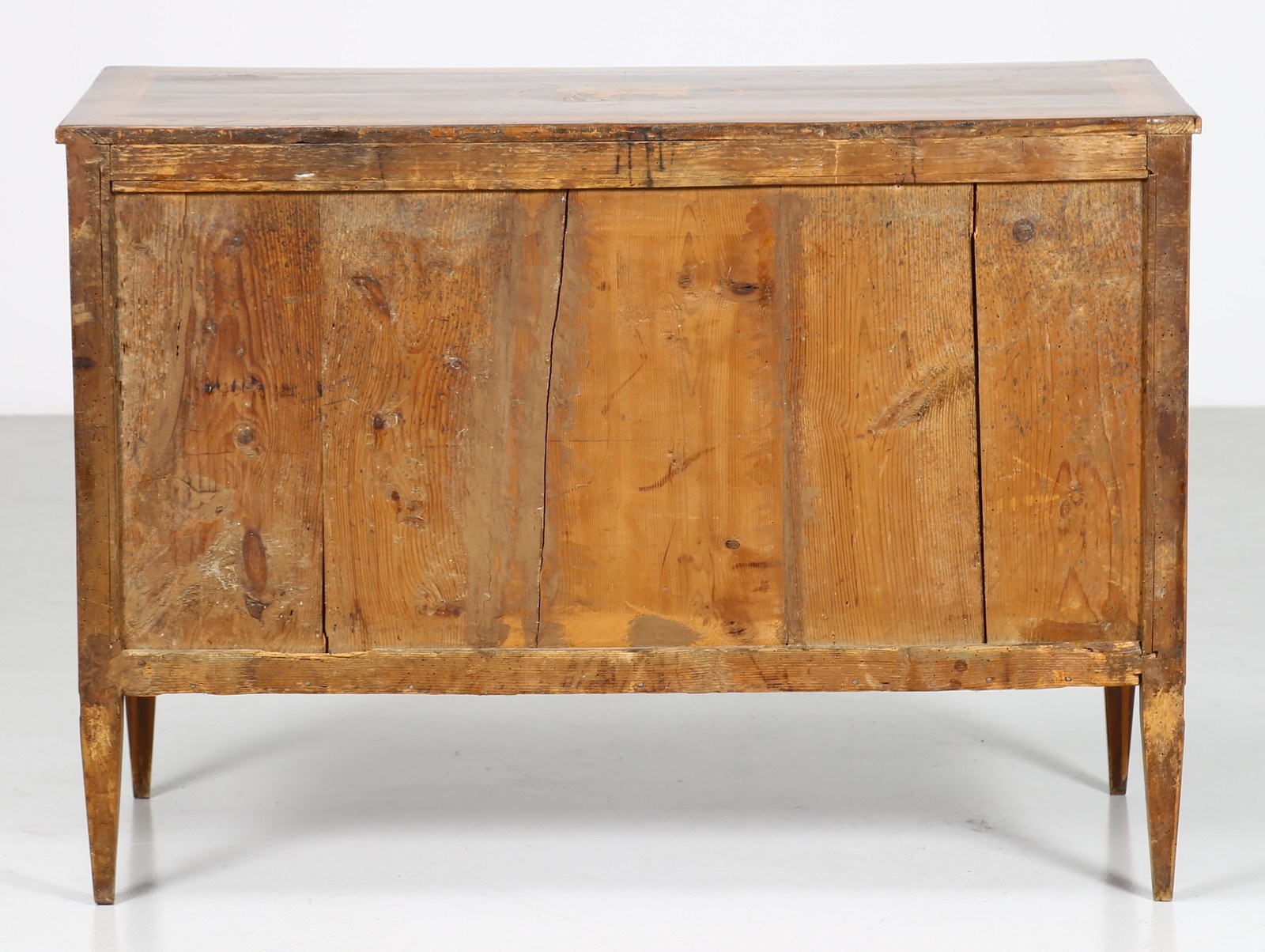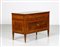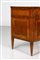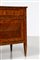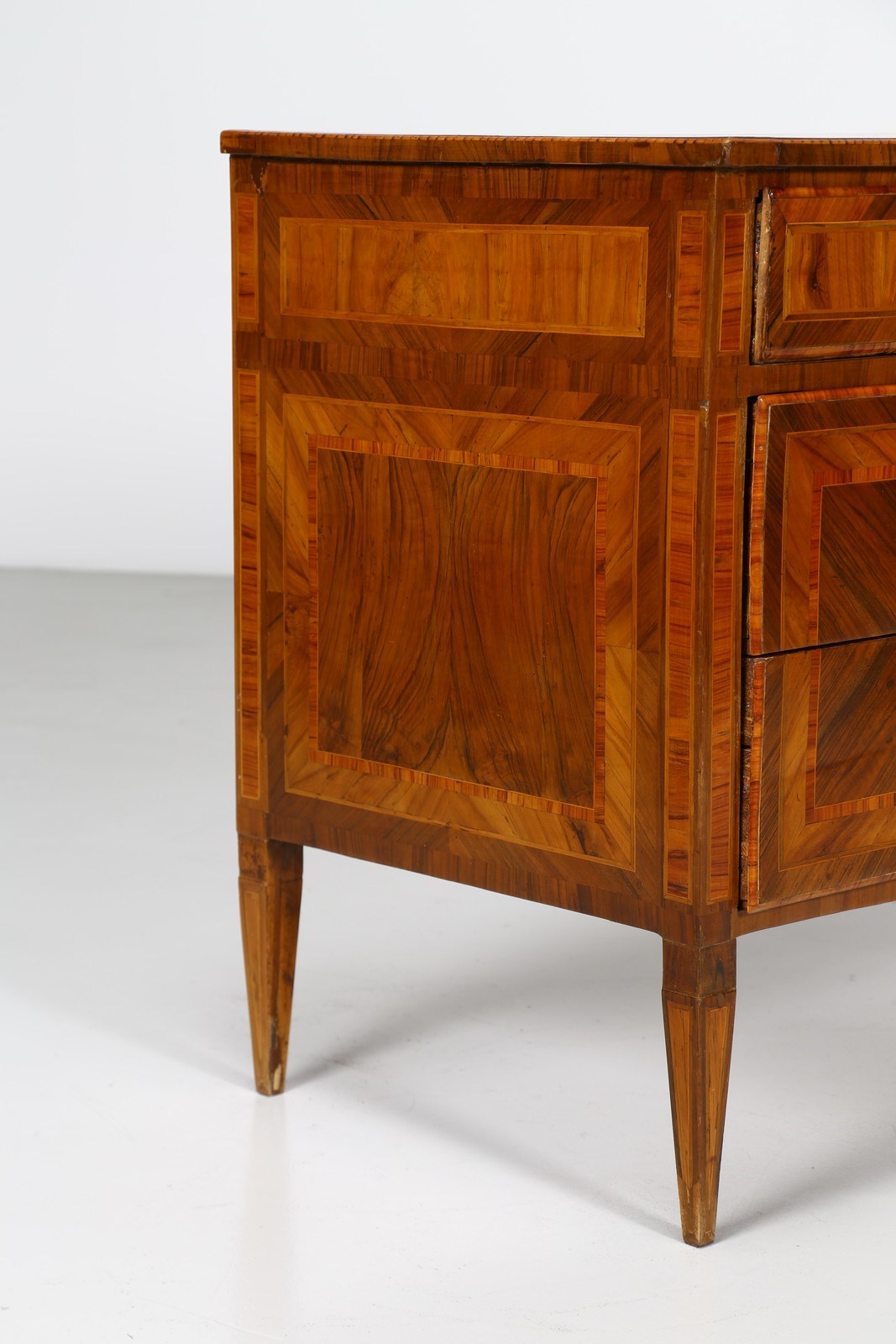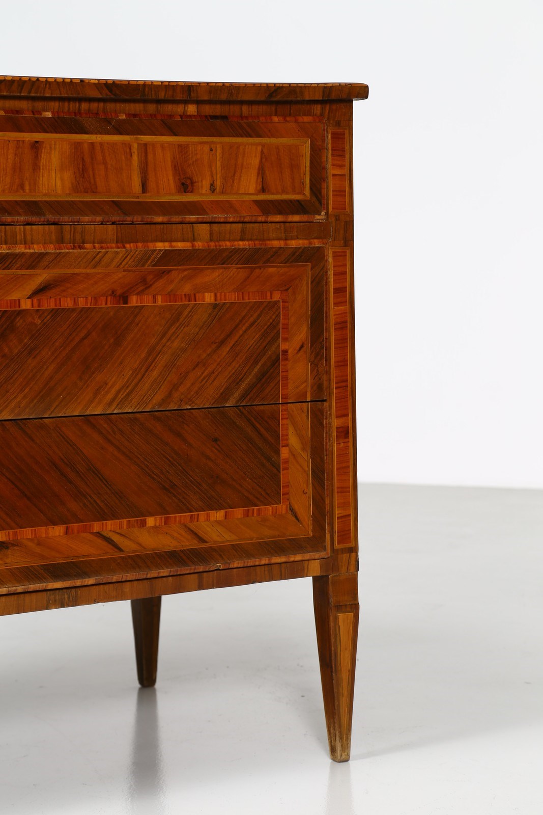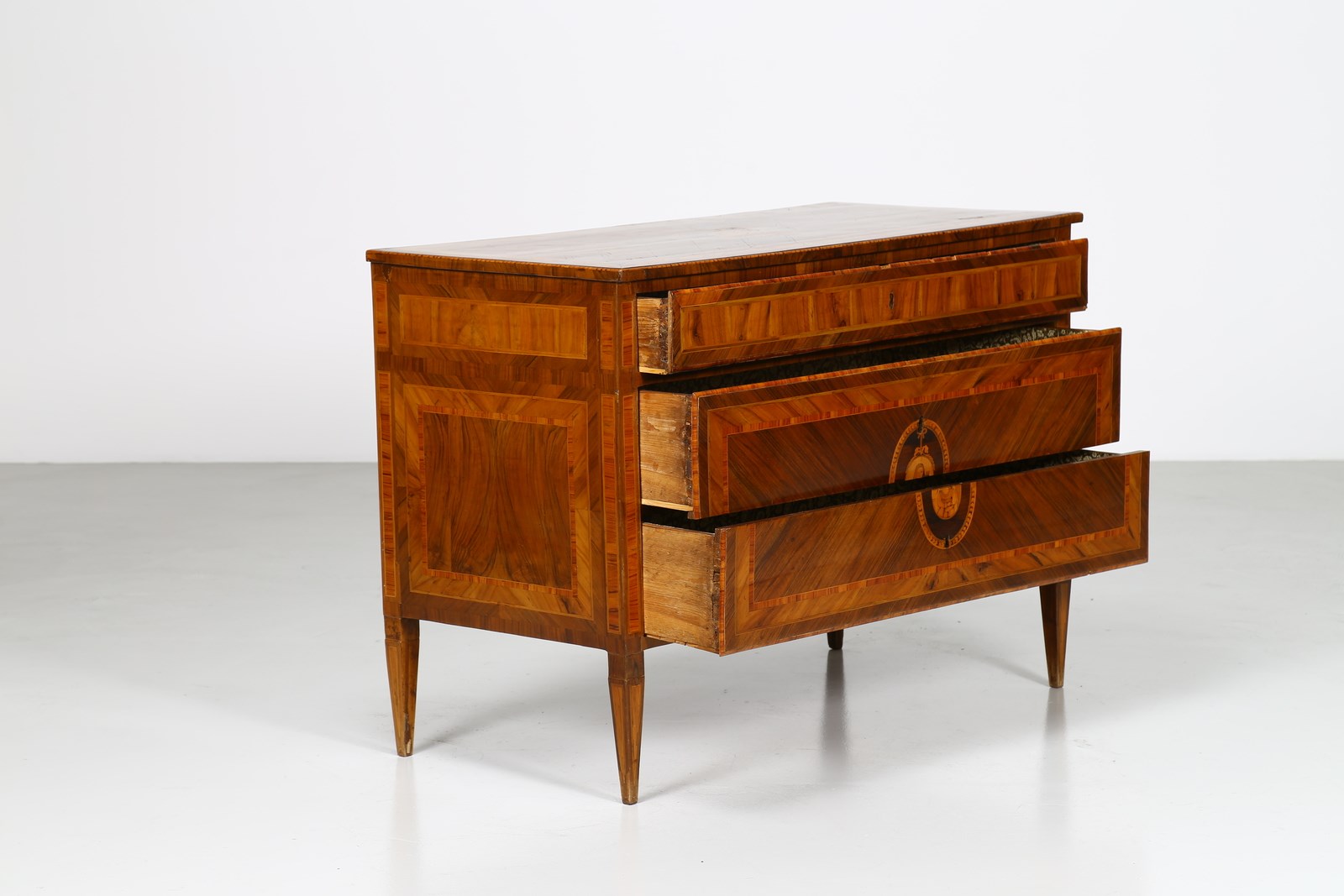 MANIFATTURA LOMBARDA DEL XVIII SECOLO Cassettone a tre cassetti in noce intarsiato in legni di essenze pregiate, fronte e fianchi dritti, decori figurativi entro riserve circolari sul fronte e il piano, gambe troncopiramidali.
