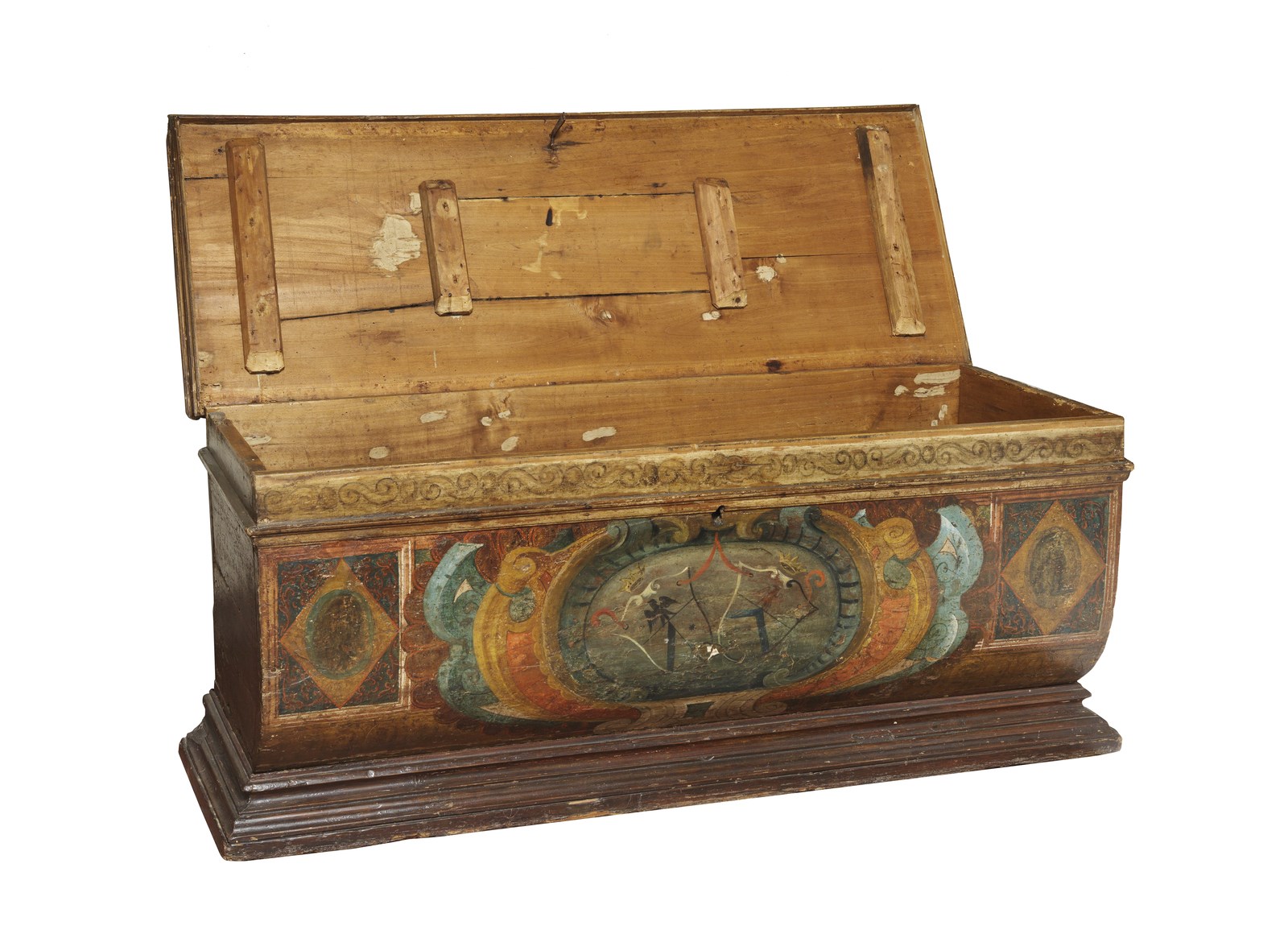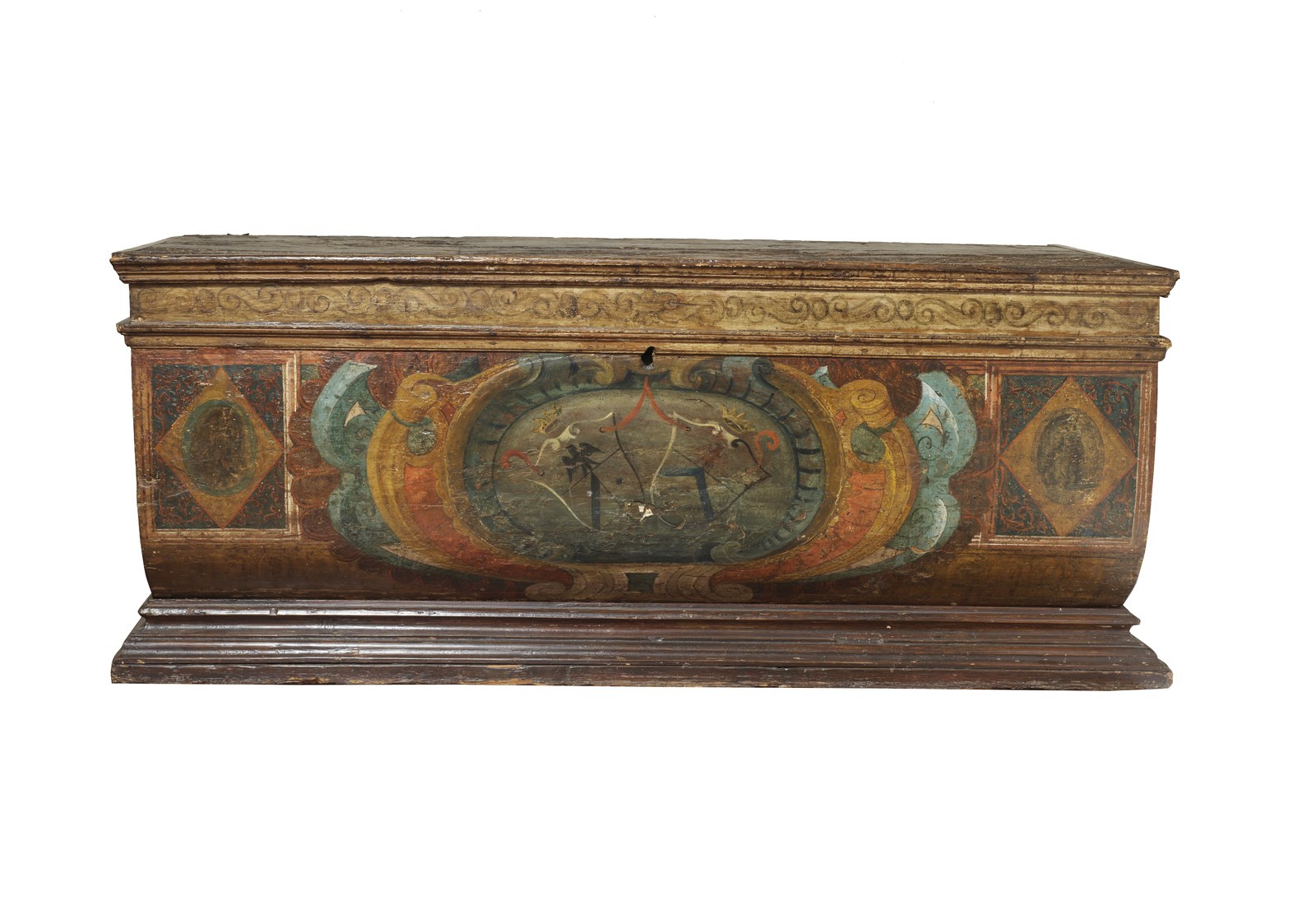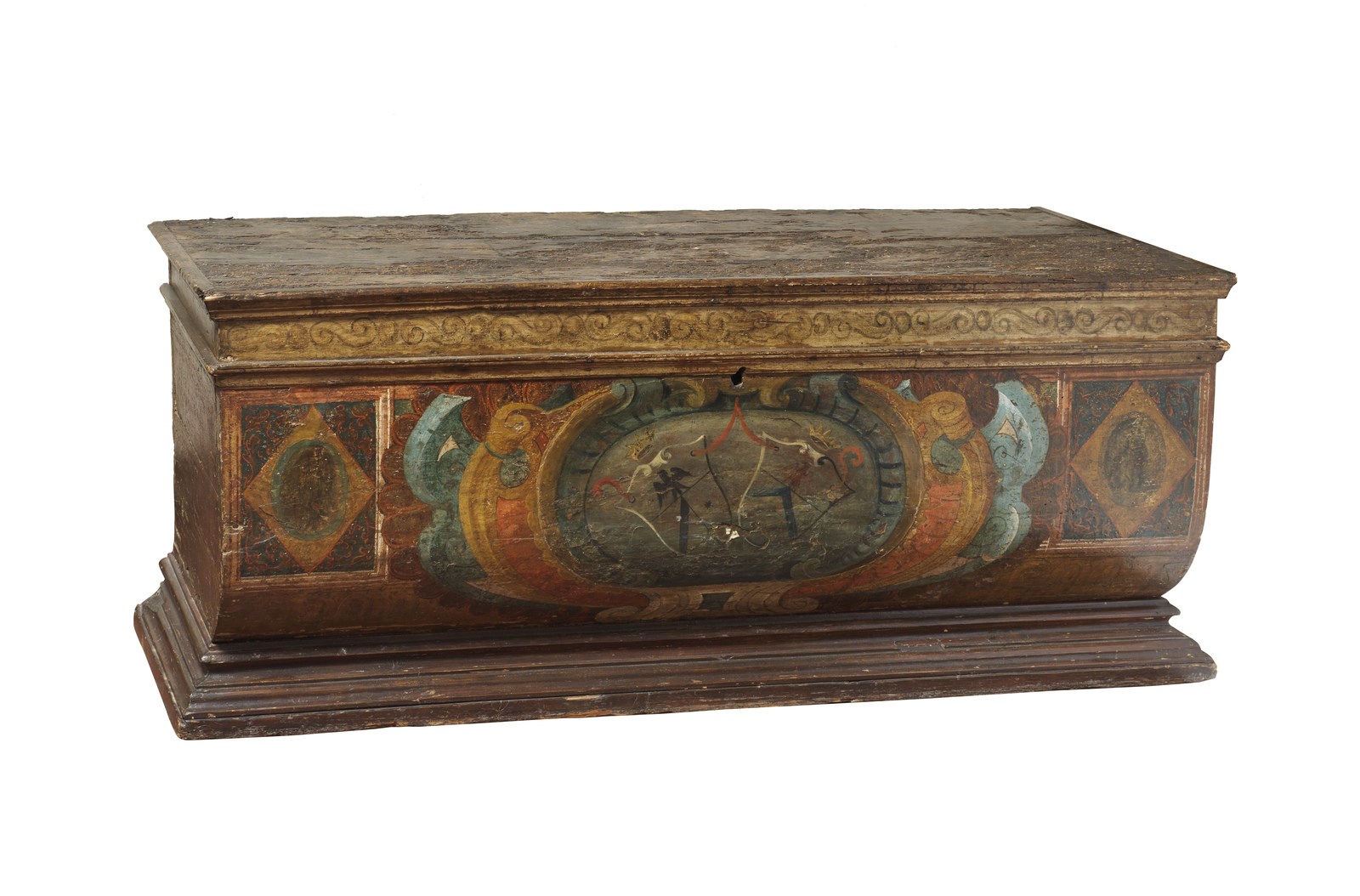 Lot 58 | MANIFATTURA TOSCANA DEL XV SECOLO Cassone nuziale in gattice realizzato a foggia di urna e dipinto in policromia, lievemente bombato centrato da stemma gentilizio. .